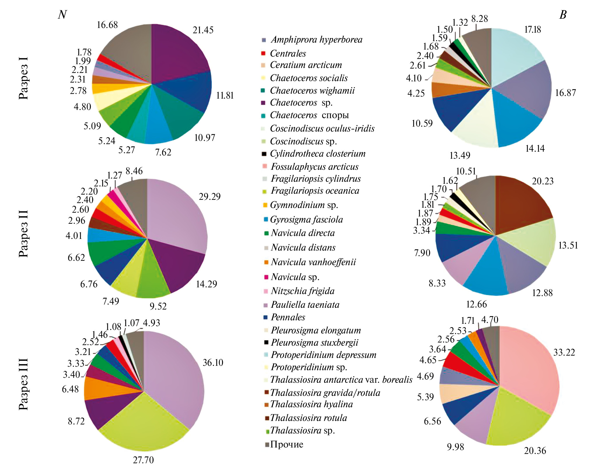 Как видно из представленных диаграмм (рис. 3), общие уровни обоих показателей характеризовались значительными отличиями, как между различными участками исследованной акватории, так и между станциями внутри разрезов. Наиболее ярко была выражена разница в горизонтальном распределении организмов. На Разрезе I их повышенные концентрации обнаруживались в средней части, на Разрезе II – у ледовой кромки, на Разрезе III – в области, наиболее удаленной ото льда. Причем на акватории последнего участка резко выделялась точка, самая дальняя от кромки: здесь численность фитопланктона в 2 раза больше максимальных величин, зарегистрированных в остальной части исследованного района, а биомасса – в 1.5 раза.