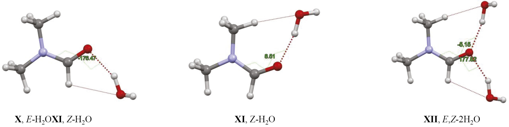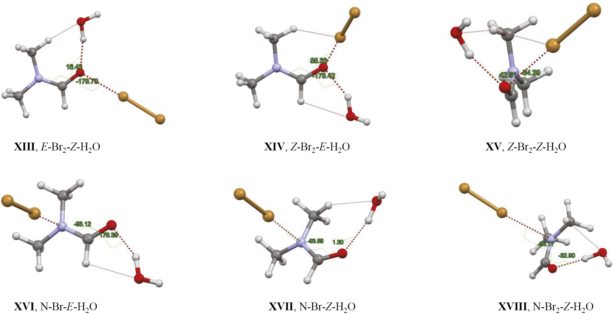 Вода и бром продуцируют смешаннолигандные тройные комплексы (рис. 5). В комплексе XVII молекулы Br2 и воды примыкают к молекуле ДМФА супрафациально (по одной и той же грани), в комплексе XVIII антарафациально (координируются по разным граням). Во всех комплексах брома длина связи Br–Br увеличивается, в наибольшей степени – при координации в положение E (по сравнению с Z или N). Одновременное участие карбонильного кислорода альдегидной группы в образовании галогеновой и водородной связи известно [51]. В комплексах с координацией электрофилов по кислороду межатомное расстояние O···Br (в комплексах I, II, IV–VI, XIII–XVIII) или O···H (в комплексах VII, VIII, X–XVIII) меньше суммы ван-дер-ваальсовых радиусов. В молекуле ДМФА увеличивается длина связи С=О, напротив, связь ОС–N укорачивается. Изменения других ковалентных связей не превышают 0.003 Å, и молекула ДМФА в целом остается плоской. В комплексах с координацией по атому азота III (MPP = 0.106 Å, размах отклонений – 0.294 Å) и IX, XVI–XVIII планарность молекулы ДМФА существенно нарушается, межатомное расстояние N···Br (N···H в комплексе IX) меньше суммы ван-дер-ваальсовых радиусов. При этом длина формально ординарной связи OC–N увеличивается, тогда как двойной С=О уменьшается.