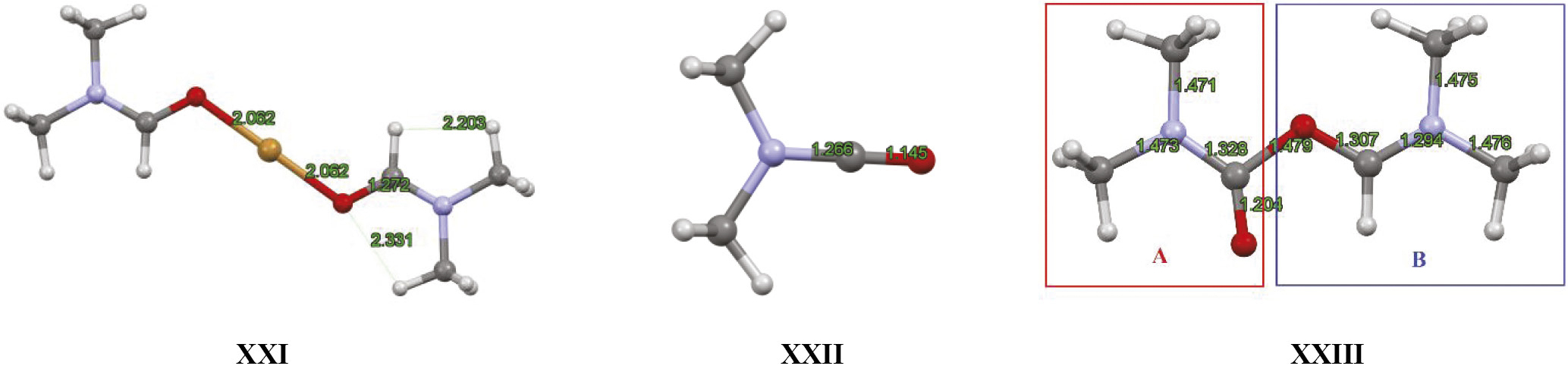 В предполагаемом интермедиате XXIII все неводородные атомы близки к созданию единой плоскости (MPP = 0.017). В кето-фрагменте А связи С=О и Ме2N–CO укорочены по сравнению с исходным ДМФА, связи Н3С-N удлинены; в эфирном фрагменте В межатомное расстояние С–О (бывшая связь С=О) увеличено по сравнению с ДМФА, связь Ме2N–CO укорочена, связи Н3С–N удлинены.