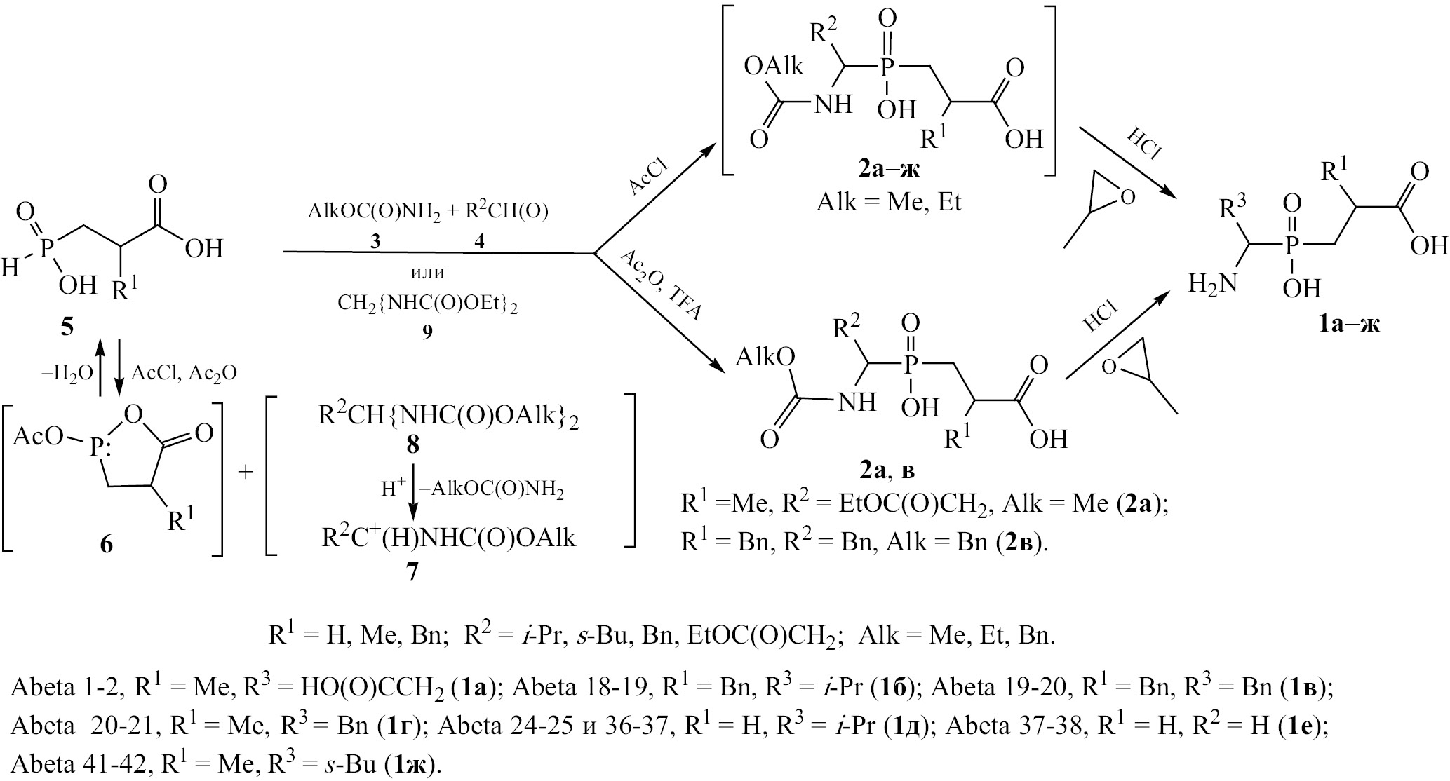 Кроме того, синтез N-защищенных фосфиновых пептидов 2а [изостер дипептидной компоненты AspAla (Aβ1-2)] и 2в [изостер дипептидной компоненты PhePhe (Aβ19-20)] осуществлен в более мягких условиях в соответствии с N+PC процедурой амидоалкилирования фосфонистых кислот 5 (R = Me и Bn) с участием соответствующих алкилкарбаматов 3 (Alk = Me и Bn) и альдегидов 4 [R2 = EtOC(O)CH2 и Bn] в среде уксусного ангидрида в условиях кислого катализа, осуществляемого трифторуксусной кислотой (TFA) (схема 1) [17–20]. Последующий кислотный гидролиз N-защищенных пептидов 2а и 2в также позволил получить фосфиновые пептиды 1а и 1в в свободной форме, физико-химические и спектральные данные которых значительно не отличались от данных для пептидов 1а и 1в, полученных более простым методом, описанным выше.
