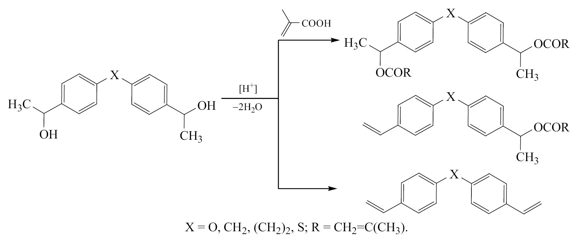 Двувторичные жирноароматические диолы являются прекурсорами пара-дивинилбензола [1] и других дивинилароматических мономеров, которые широко используются в качестве сшивающих агентов при получении сетчатых полимеров [2–7]. Термохимические превращения метакриловых эфиров этих диолов (схема 1) являются основой химии роливсанов – полифункциональных термореактивных смол нового типа, образующих стеклообразные сетчатые полимеры, которые способны изменять свою химическую, топологическую, надмолекулярную структуру и свойства в процессе термической обработки [8–13]. В отличие от пара-дивинилбензола дивинилароматические соединения с мостиковыми группами (Ar-O-Ar, Ar-CH2-Ar, Ar-S-Ar), получаемые из данных диолов, образуют менее жесткие и более термостойкие сетчатые полимеры [14].