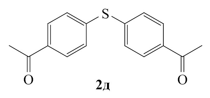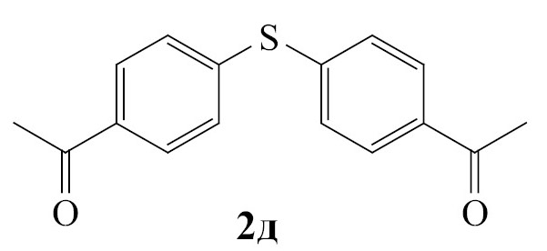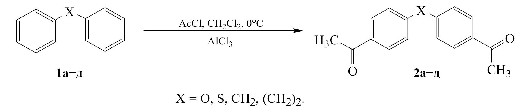 Синтез прекурсоров (жирноароматических дикетонов д) был осуществлен нами ранее ацетилированием ароматических углеводородов: дифенилоксида [11–13, 15, 16], дифенилметана(этана) , в [17], бифенила [18] и дифенилсульфида [19] по реакции Фриделя–Крафтса [20] (схема 2, табл. 1).