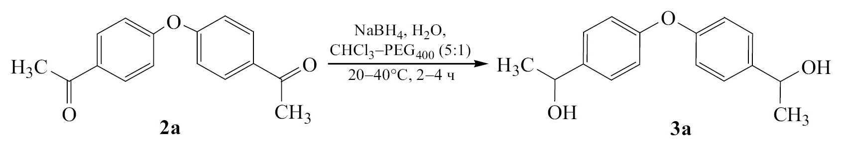 В литературе широко представлены методы гидрирования таких известных и близких по химической структуре кетонов, как ацетилбензол (ацетофенон), 1,4-диацетилбензол, 4-ацетилбифенил [26–35]. Их гидрирование проводили в присутствии как благородных (Pd, Pt), так и неблагородных (Ni, Cu, Mo, Co) металлов, нанесенных на различные подложки. Однако несмотря на структурное сходство жирноароматические дикетоны и продукты их гидрирования существенно отличаются от соответствующих монопроизводных по своим свойствам (растворимость, температура кипения и плавления, термическая стабильность и др.). Как показывают результаты наших исследований, представленных ниже (табл. 2), условия гидрирования, например, ацетофенона, обеспечивающие высокий выход 1-фенилэтанола, не могли быть просто перенесены на синтез рассматриваемых диолов и нуждались в существенной адаптации и модификации. Полученные результаты демонстрируют высокую каталитическую активность и удовлетворительную селективность (выход), проявляемую некоторыми каталитическими системами, которые содержат палладий (опыты № 9, 11, 12) и никель Ренея (опыты № 13–17). Видно, однако, что ускорение реакции, достигаемое посредством повышения (до 60–80°С) температуры (опыты № 14–16) и давления водорода (опыты № 13–16) неблагоприятно отражаются на селективности процесса гидрирования. Это связано с побочными реакциями деароматизации (гидрирования ароматических колец) [21] и гидрогенолиза [36]. Поэтому с целью нахождения более благоприятного сочетания различных факторов при получении диолов с высокими выходами и без использования дорогостоящих катализаторов (опыты № 7–12) выбраны следующие два метода (схема 3): каталитическое гидрирование дикетона в присутствии никеля Ренея (а) и его восстановление боргидридом натрия (б).