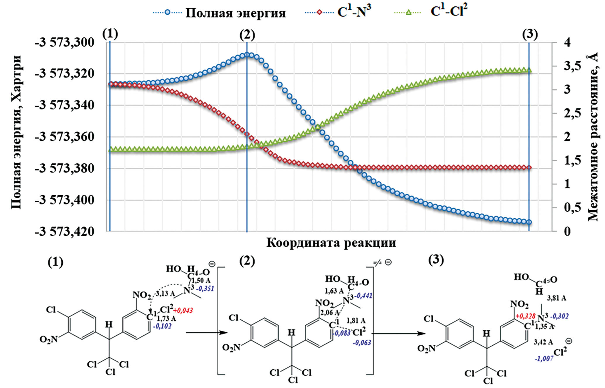Рис. 2. Энергетические профиль и динамика изменения межатомного расстояния (C1–N3, C1–Cl2) реакции нуклеофильного замещения атома хлора при взаимодействии 2,2-ди(3-нитро-4-хлорфенил)-1,1,1-трихлорэтана c карбанионом N,N- диметиламинометандиола (N-атака). Пространственные структуры предреакционного (1), активированного (2) и постреакционного комплексов (3). Заряд на атомах по Малликену (а. е.) дан курсивом.