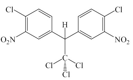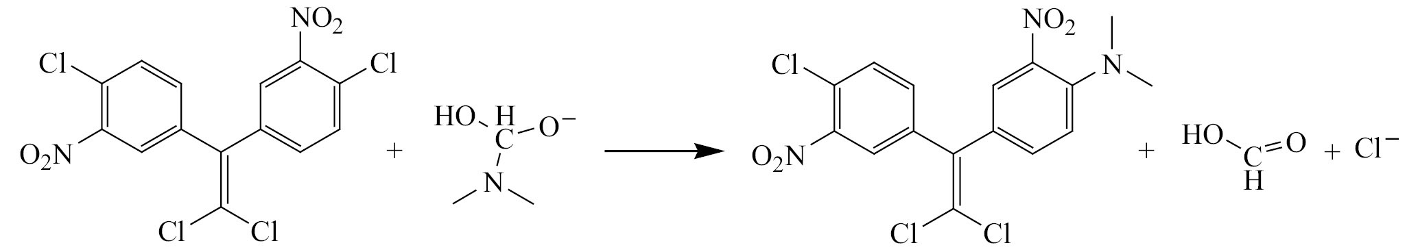 Однако, проведенные препаративные исследования не дают возможности однозначно определить последовательность протекания реакций. Нуклеофильное замещение атомов хлора на диметиламиногруппы может быть реализовано как для 2,2-ди(3-нитро-4-хлорфенил)-1,1,1-трихлорэтана, так и для продукта реакции дегидрохлорирования - 2,2-ди(3-нитро-4-хлорфенил)-1,1-дихлорэтена.