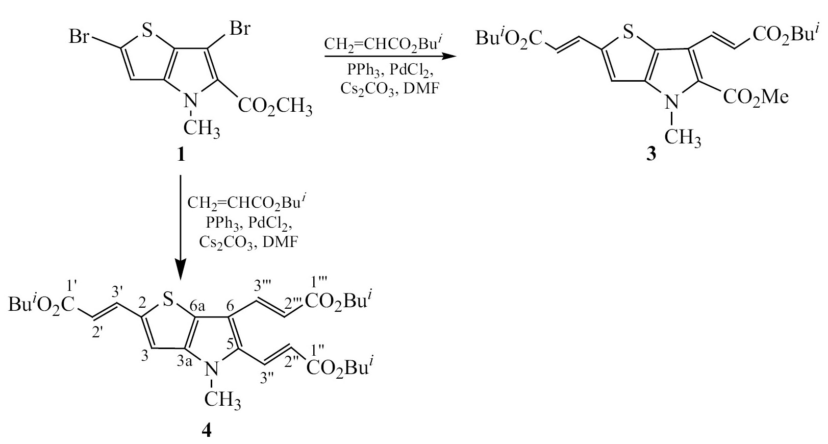 В данной работе на основе ранее синтезированных дибромидов 1, 2 [11] и метиловых эфиров 4-метил- и 4-бензил-4H-тиено[3,2-b]пиррол-5-карбоновой кислот [12] получены новые кросс-сопряженные продукты по реакции Хека применением изобутилового эфира акриловой кислоты. Реакцию проводили с избытком изобутилакрилата в присутствии системы PdCl2–PPh3–Cs2CO3 в кипящем ДМФА, контролируя ход реакции методом ТСХ.