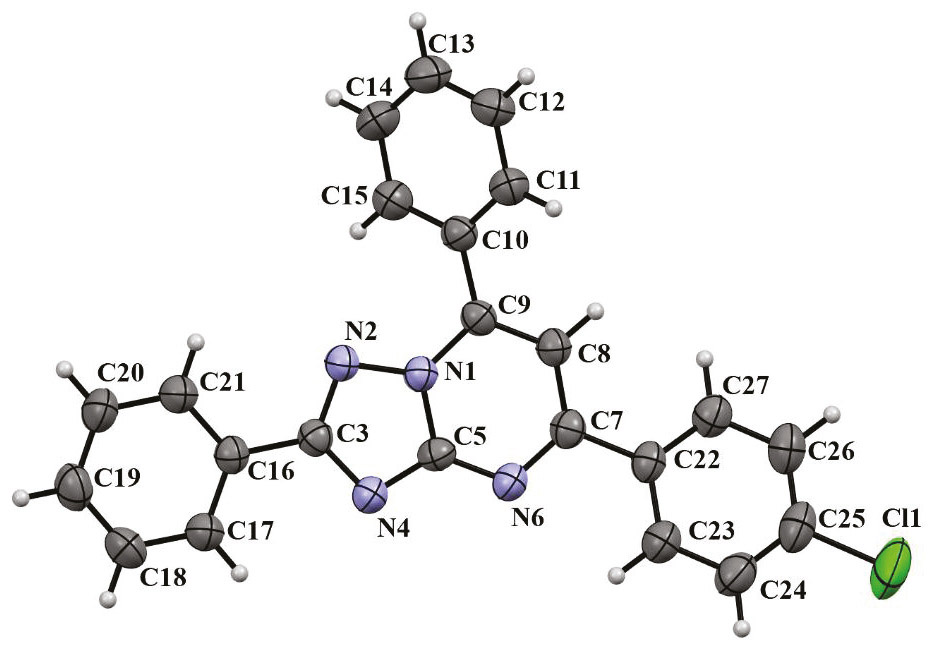 2,7-Дифенил-5-(4-хлорфенил)-[1, 2, 4]триазоло[1,5-a]пиримидин (3a). Выход 49 мг (0.13 ммоль, 30%). Спектр ЯМР 1Н (CDCl3), δ, м. д.: 7.47–7.55 м (5H, Ph, C6H4Cl), 7.60 с (1H, H6), 7.63–7.68 м (3H, Ph), 8.21–8.27 м (4H, Ph, C6H4Cl), 8.38–8.43 м (2H, Ph). Спектр ЯМР 13C (CDCl3) δС, м. д.: 127.5, 127.7, 128.7, 129.0, 129.1, 129.3, 129.6, 130.2, 130.5, 130.7, 131.9, 134.9, 137.7, 147.8, 157.2, 159.8, 166.2. Масс-спектр, m/z (Iотн, %): 383.11 (100) [М + Н]+. Найдено, %: С 72.28; Н 4.12; N 14.78. С23Н15ClN4. Вычислено, %: С 72.16; Н 3.95; N 14.63. Кристаллы соединения (M 382.86) триклинные, параметры элементарной ячейки при 295(2) K: a = 7.6939(6), b = 10.1904(6), c = 12.3487(8) Å, α = 91.435(5)°, β = 91.364(5)°, γ = 104.532(6)°, пространственная группа P-1. V = 936.46(11) Å3, Z = 2, dвыч = 1.358 г/см3, μ(MoKα) = 0.220 мм–1, F(000) = 396. На углах рассеяния 5.204°51.166° измерено 6480 отражений (4225 независимых отражений, Rint = 0.0243, Rsigma = 0.0715), R1 = 0.0558, wR2 = 0.0558 [для отражений с I > 2σ(I)] и R1 = 0.1232, wR2 = 0.1438 (для всех данных), GOOF = 1.008. Максимальный и минимальный пики остаточной электронной плотности 0.193/–0.212 ēÅ–3. Результаты рентгеноструктурного анализа зарегистрированы в Кембриджской базе структурных данных (CCDC 2294769).