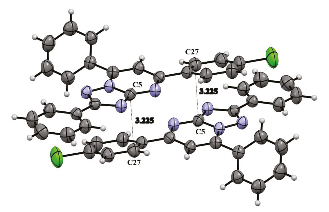 В кристаллах молекулы соединения 3a формируют центросимметричные димеры посредством π-стекинга с образованием укороченных С–С контактов между 1,2,4-триазоло[1,5-a]пиримидиновым и 4-хлорфенильным фрагментами С5···С27 3.225(3) Å [–x, –y, 2–z] (рис. 2).