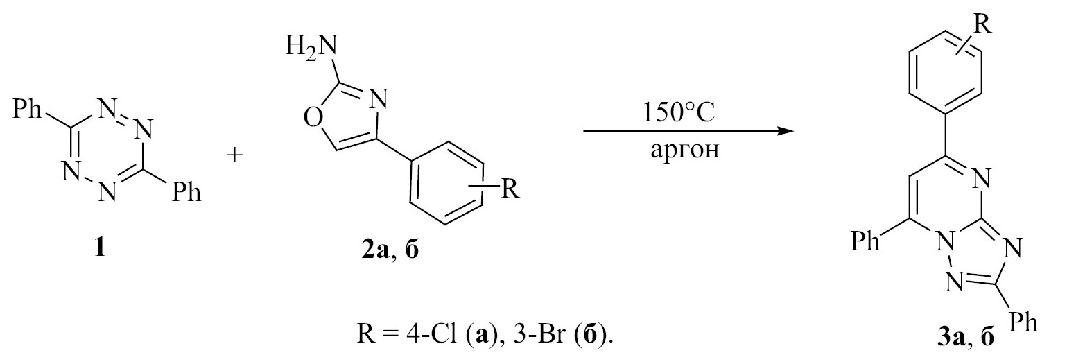 Общая методика получения [1, 2, 4]триазоло[1,5-а]пиримидинов 3a, б. Смесь 1,2,4,5-тетразина 1 (99.0 мг, 0.42 ммоль) и 2-аминооксазола 2 (0.46 ммоль) перемешивали при 150°C в течение 8 ч в атмосфере аргона. Реакционную массу охлаждали до комнатной температуры. Продукт выделяли колоночной хроматографией (элюент – этилацетат–дихлорметан, 1:9, Rf 0.9) и перекристаллизовывали из ацетонитрила.