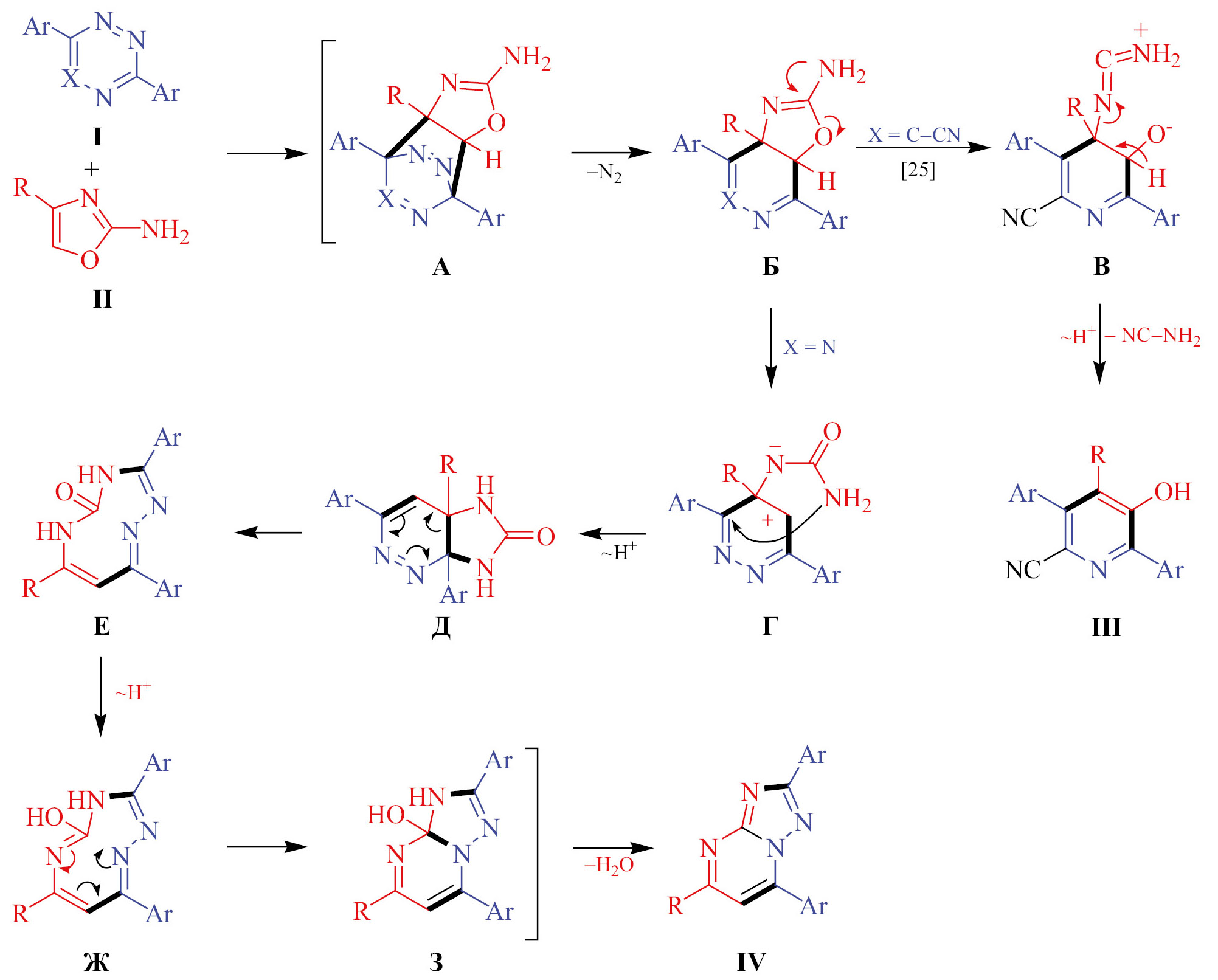 Механизм обнаруженной новой перегруппировки 1,2,4,5-тетразинов (I, X = N), в сравнении с ранее описанным механизмом взаимодействия 1,2,4-триазин-5-карбонитрилов (I, X = C–CN) с 2-амино-4-арилоксазолом, представлен на схеме 2. Так, процесс начинается, как и в предыдущем случае [25], с [2+4]-циклоприсоединения оксазольного диенофила II к тетразину I. Последующее элиминирование молекулы азота приводит к образованию аннелированного оксазола Б. Затем, в зависимости от его строения, он претерпевает трансформации по двум направлениям: при X = C–CN происходит раскрытие оксазольного цикла с образованием интермедиата В, который элиминирует молекулу цианамида, образуя продукт III, как было описано ранее [25]. В случае же X = N также происходит раскрытие оксазольного цикла, но за ним следует внутримолекулярное присоединение амидной группы мочевины по двойной связи C=N, приводящее к диазалону Д. При этом различия известной [25] и наблюдаемой реакции, по-видимому, связаны с более акцепторным характером атома углерода при заместителе Ar в интермедиате Г. В этом случае аннелированный диазолон Д подвергается 6π-электроциклическому раскрытию пиридазинового цикла с образованием 1,2,4,6-тетразонин-5-она Е, который затем электроциклизуется с элиминированием молекулы воды через структуры Ж и З в конечный продукт IV.