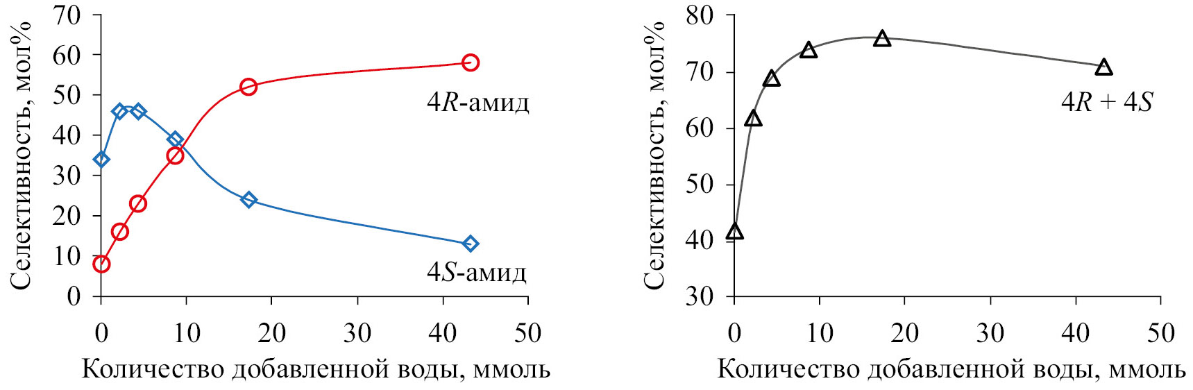 Рис. 3. Зависимость селективности по амидам октагидро-2Н-хроменов от количества добавляемой воды на катализаторе K10-CSA.