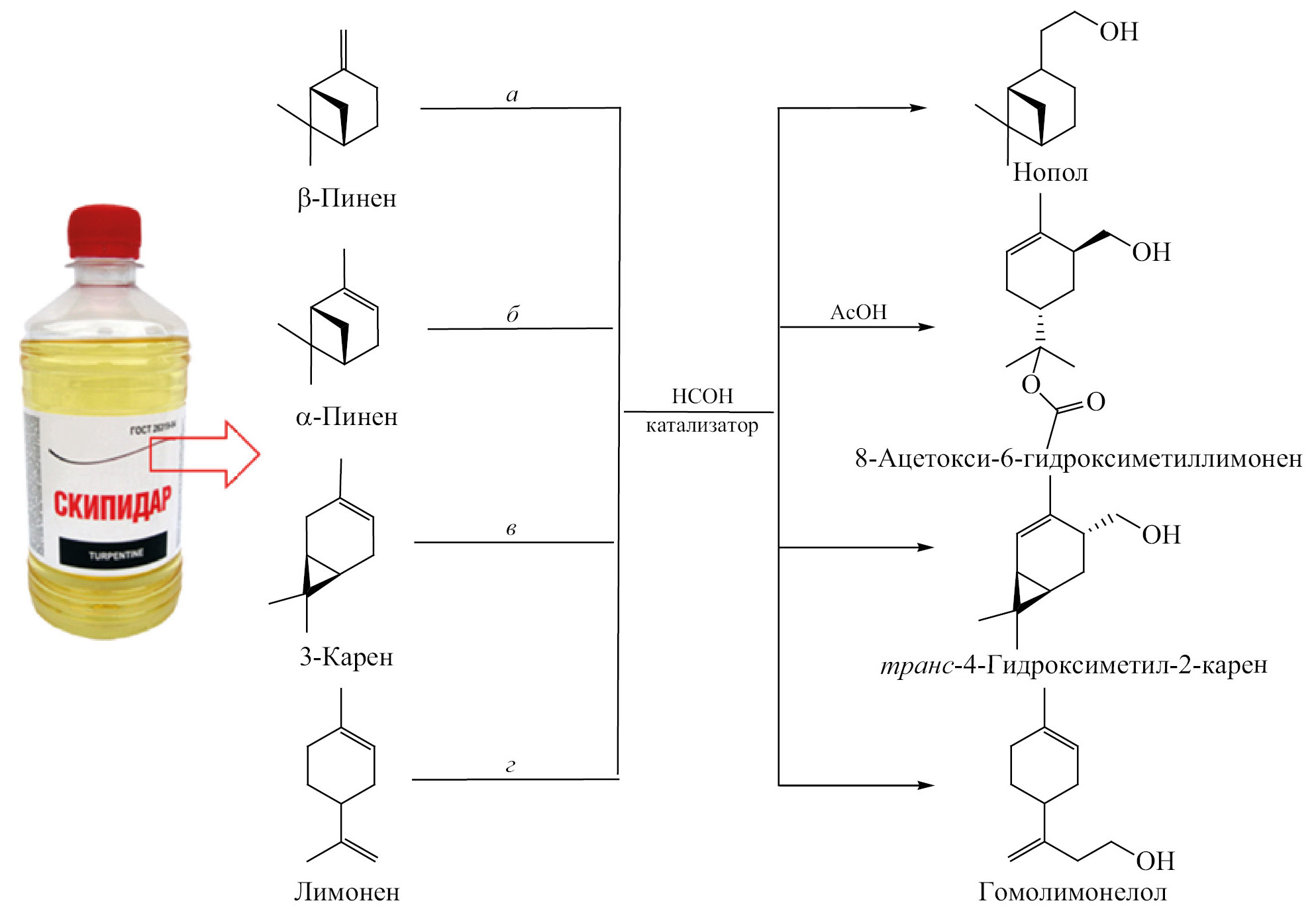 Основным источником возобновляемых углеводородов является скипидар, который ежегодно производится в количестве около 360 000 т и в основном содержит α-пинен (40–85%), β-пинен (до 35%) и 3-карен (до 40%) [4]. Конденсация терпеновых углеводородов с формальдегидом позволяет получать соединения, содержащие гидроксиметильный фрагмент, которые используются в парфюмерии и в качестве молекул-платформ для дальнейшего синтеза различных соединений [1, 3, 5]. Реакции непредельных терпеновых спиртов с альдегидами приводят к соединениям, содержащим тетрагиропирановые, тетрагидрофурановые и др. фрагменты [3].