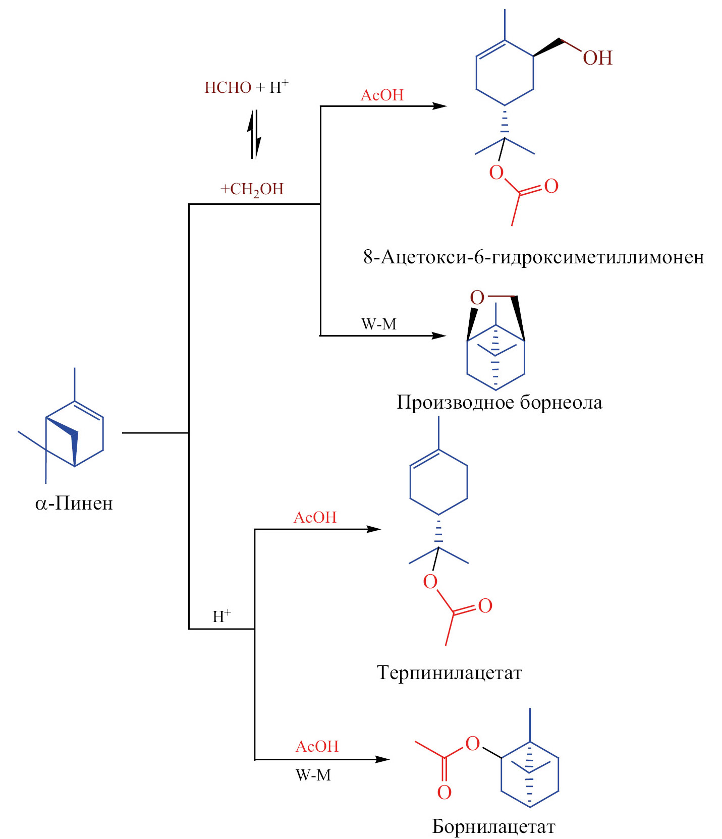 В присутствии сильнокислотного цеолита H-Beta-25 (301.0 мкмоль/г) и фосфорной кислоты селективность по продуктам конденсации α-пинена с формальдегидом и его протонирования сопоставима [18]. При этом в присутствии H3PO4 образуется наименьшее количество продуктов перегруппировки Вагнера–Меервейна (W-M), что обуславливает наибольшую селективность по 8-ацетокси-6-гидроксиметиллимонену (24.0%). Этот терпеноид можно рассматривать как новую хиральную платформу для дальнейшего синтеза, в том числе биологически активных соединений [18].