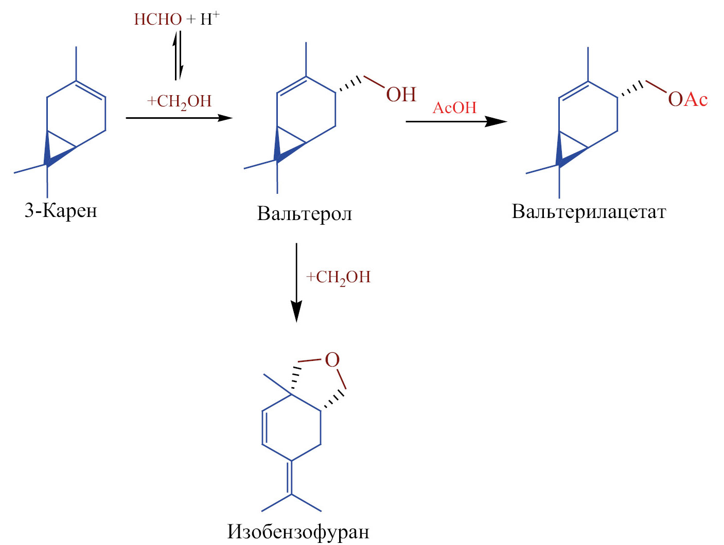 В реакции 3-карена с формальдегидом в качестве одного из продуктов образуется транс-4-гидроксиметил-2-карен (вальтерол, схема 2, в) [19, 20]. Классический двухстадийный синтез вальтерола включает кипячение исходного реагента с параформом в уксусной кислоте без катализатора и последующее омыление полученного ацетата с выходом целевого продукта около 30.0% [19]. Вальтерол имеет цветочный запах с фруктовыми «нотками», его промышленное производство было освоено парфюмерной компанией Dragoco [20]. Важно отметить, что вальтерол является базовым соединением для получения целого ряда хиральных гетероциклических продуктов [21–23], некоторые из которых обладают высокой цитотоксической активностью [22].
