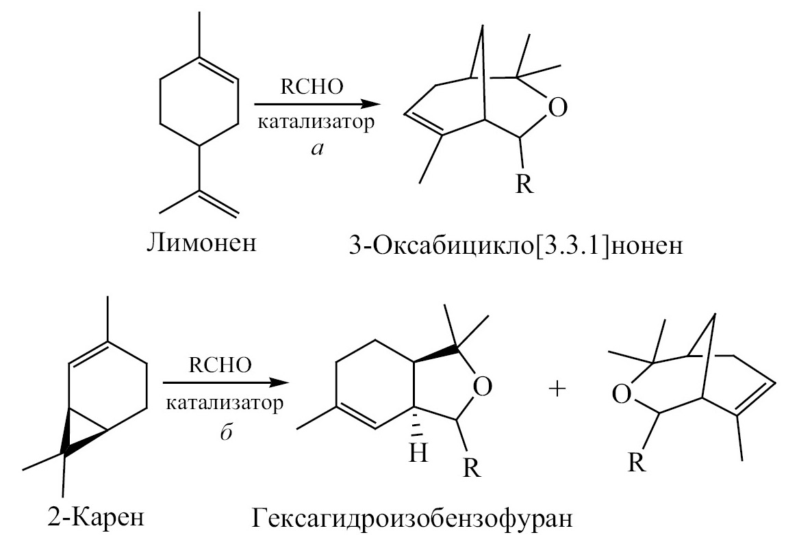 Лимонен также способен вступать в реакцию конденсации с алифатическими и ароматическими альдегидами (схема 5, а) с участием его обеих двойных связей, что приводит к образованию гетероциклических соединений со структурой 3-оксабицикло[3.1.1]нонана [28–31]. Впервые синтез этого соединения описан в присутствии природной бентонитовой (монтмориллонитовой) глины [28].