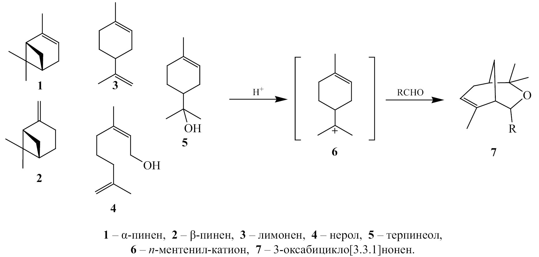 Известны также примеры участия некоторых терпеноидов, в частности мирцена, вербенола, транс-собрерола, эпоксидов α- и β-пиненов и др. в реакциях с альдегидами, приводящих к образованию соединений со структурой 3-оксабицикло[3.3.1]нонена, что детально описанно в обзоре [3].
