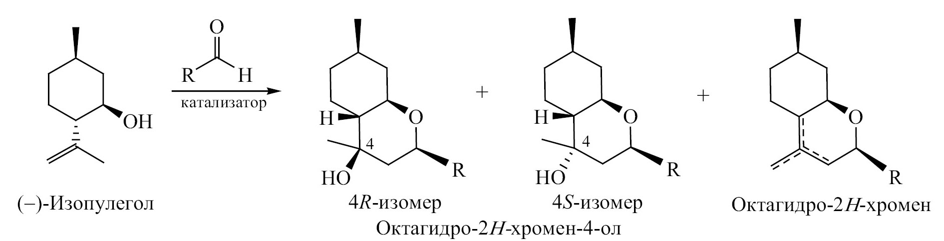Возможность конденсации (–)-изопулегола с ароматическими и алифатическими альдегидами (схема 7) в присутствии гетерогенного катализатора (монтмориллонита К-10) при микроволновом излучении показана в работе [42]. Продуктами реакции являются замещенные октагидро-2Н-хромен-4-олы в виде 4R- и 4S-изомеров, общие выходы которых составляли до 86.0% в случае 4-метил- и 4-метоксизамещенных бензальдегидов.
