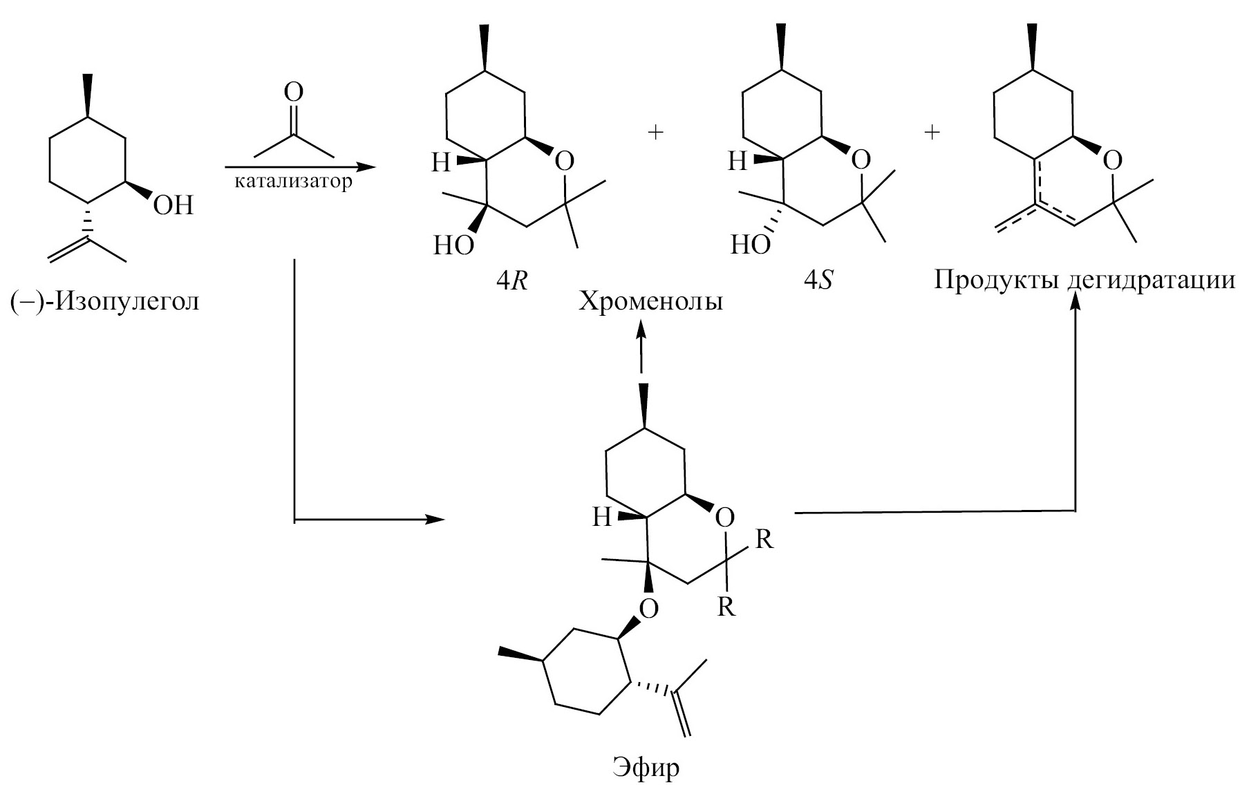Результаты систематического исследования каталитической конденсации (–)-изопулегола с тиофен-2-карбальдегидом изложены в работах [46–48]. Установлено, что в присутствии кислотно-модифицированной иллитовой глины белорусского месторождения Лукомль-1 выход 4R-изомера увеличивается с уменьшением кислотности катализатора и температуры реакции, ростом соотношения катализатор/реагенты, а также начальной концентрации реагентов, достигая 70.0% [46]. Показано, что образование побочных продуктов, октагидро-2Н-хроменов, происходит как непосредственно из реагентов, так и за счет дегидратации 4R-диастереомера октагидро-2Н-хромен-4-ола [46].