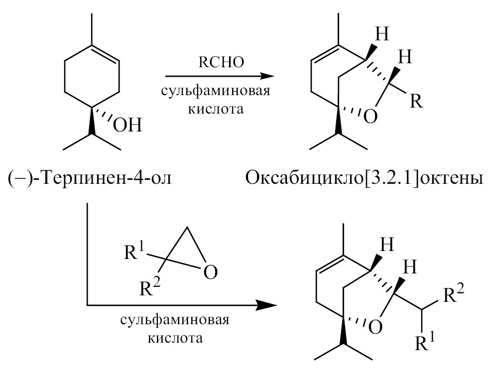 В работе [62] сообщается о синтезе новых соединений со структурой оксабицикло[3.2.1]октена путем конденсации (–)-терпинен-4-ола с альдегидами, либо эпоксидами в присутствии сульфаминовой кислоты (схема 11) с выходами целевых продуктов до 97.0%.