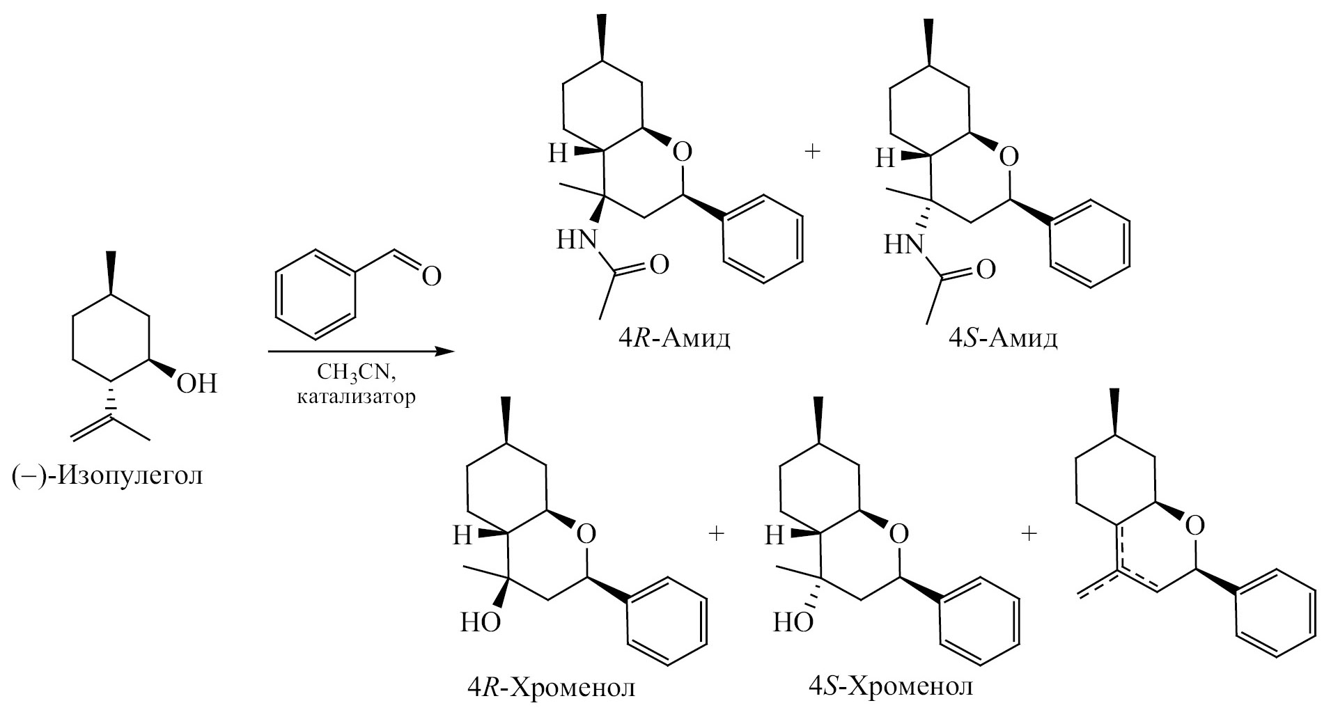 Известно [68], что полученные из (–)-изопулегола октагидро-2Н-хромены, содержащие амидные фрагменты, являются мощными ингибиторами фермента TDP1 и перспективны для комплексной противораковой терапии. Согласно работе [69], синтез 4-амидотетрагидропирановых соединений (в виде 4R- и 4S-изомеров) на основе этого терпеноида можно осуществить по тандемной реакции Принса–Риттера в присутствии избытка (2.0–3.0 экв.) трифторметансульфоновой кислоты и при низких температурах (от –50 до –25°С), поскольку в более мягких условиях процесс неселективен.