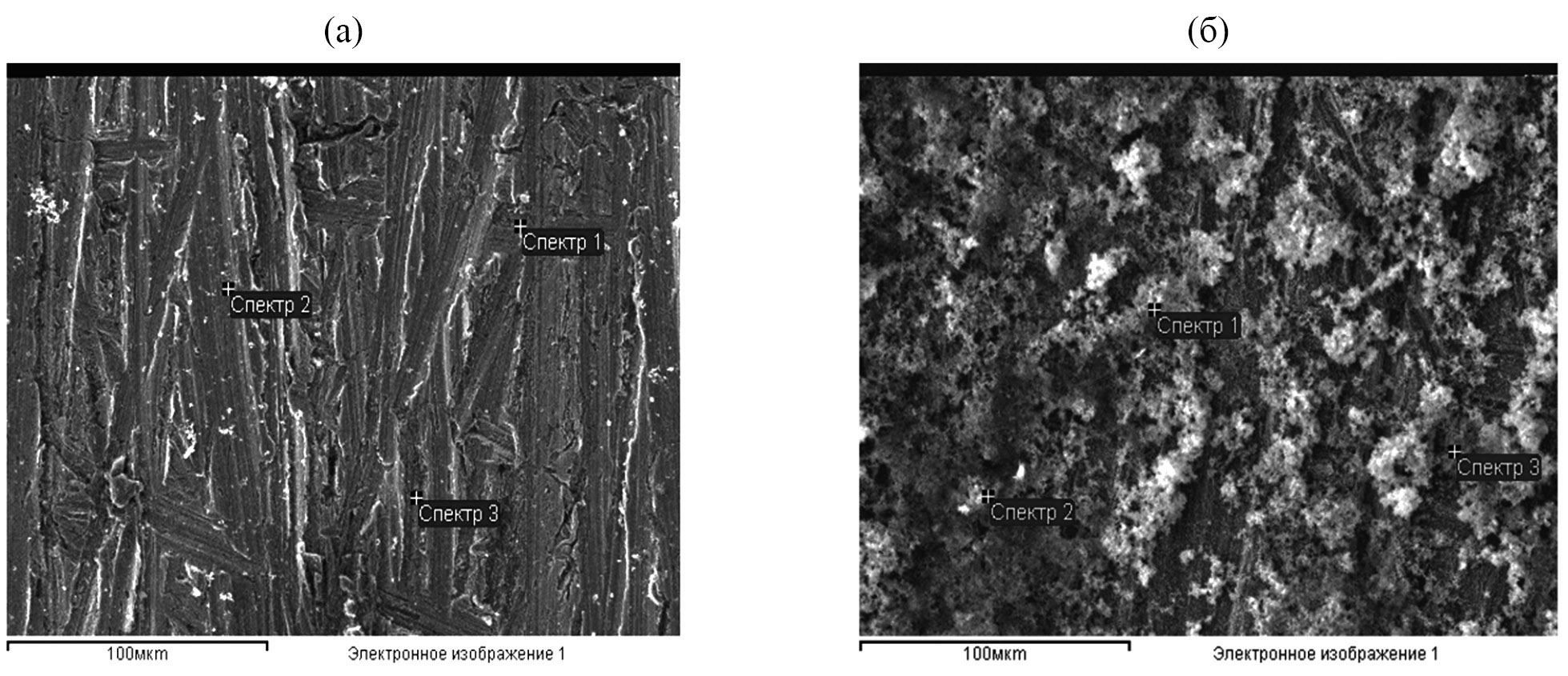 Рис. 2. СЭМ-Изображение поверхности пластины до (а) и после (б) эксперимента по коррозии.