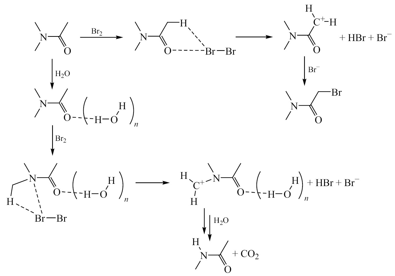 В присутствии значительных количеств воды реакция приводит к дибромбромату 1, дибромбромату бис(N-метилацетамид)водорода 3 и двуокиси углерода (схема 2).