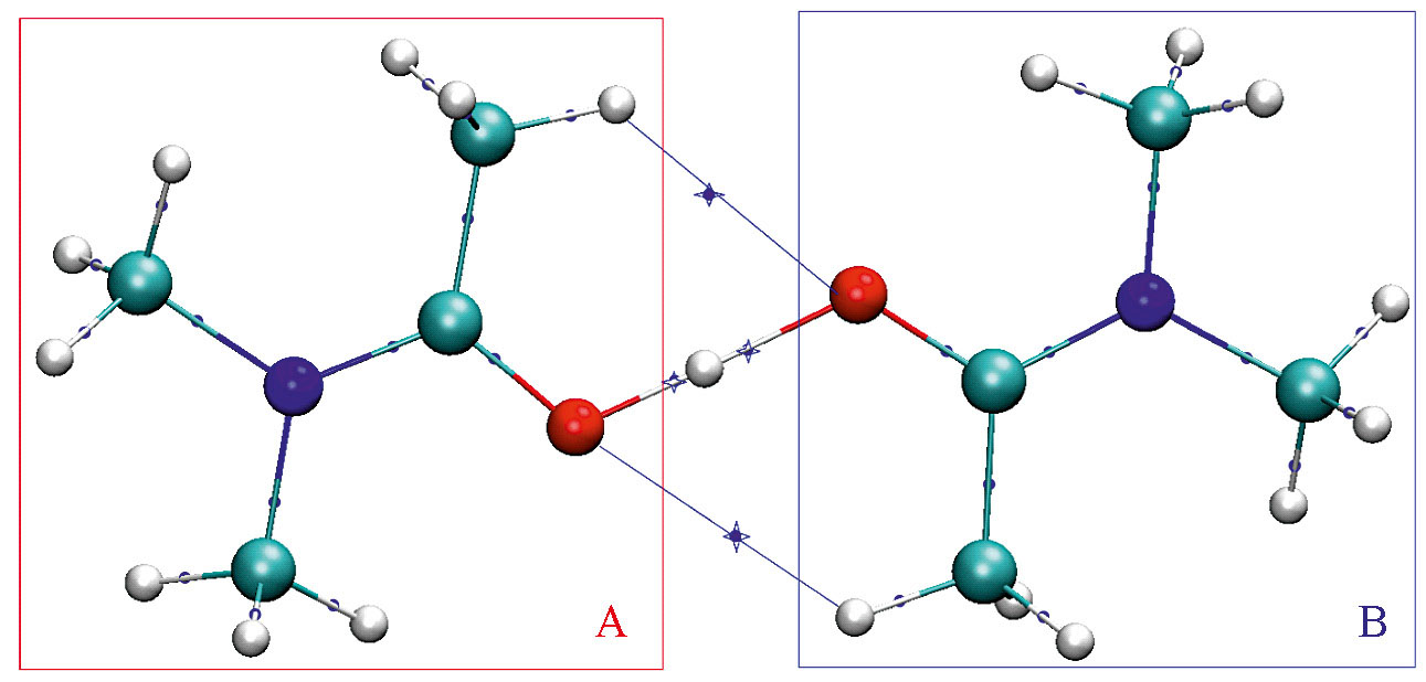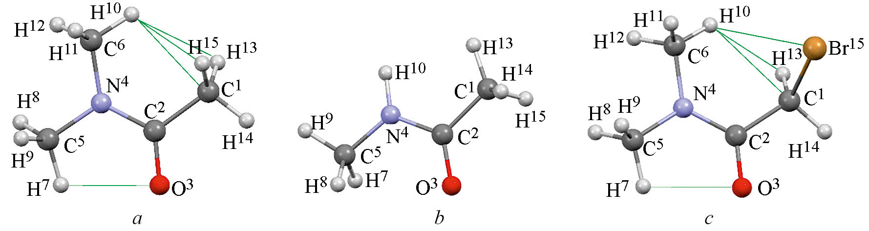 Вторичные и третичные амиды низших монокарбоновых кислот широко используются в органическом синтезе [1–3], их аналоги и производные (в том числе комплексы с донорами водородной и галогеновой связи) нашли применение в качестве лекарственных средств [4, 5], компонентов косметических композиций [6] и электрохимических устройств [7, 8]. Химические и физические свойства амидов изучены и систематизированы, изложены в ряде монографий [1, 2] и обзоров [3, 9], для простейших – приведены в учебниках. Молекулярное строение простейших амидов – N,N-диметилацетамида (ДМА) и N-метилацетамида (НМА) – установлено прямыми экспериментальными методами [10–14]. В согласии с общепринятыми представлениями о геометрии амидов, молекула НМА планарна как в кристалле [10, 12], так и в газовой фазе [11]. В газовой фазе атомы остова молекулы ДМА отклоняются от плоскости [13]. Расчеты в различных приближениях [15–25], как правило, приводят к плоским структурам, за редкими исключениями [26]; связи C–H лежат в этой плоскости, по одной от каждой метильной группы. Структурно изучен только термодинамически более стабильный [27, 28] цис-изомер НМА с синперипланарной ориентацией N-метильной группы относительно кислорода и амидной связи C–N. Внутримолекулярная динамика колебаний и вращений по связям C–C и C–N амидов изучена экспериментальными [29–33] и расчетными [18, 20, 23, 24] методами. Указаний на внутримолекулярные взаимодействия в амидах с участием атомов водорода немного [13, 34]. Примеров оценки внутримолекулярных C–H···CH₃ взаимодействий (подобных найденным в комплексах протонодоноров с алканами [35–38] и в ансамблях металлорганических соединений [39]) в молекулах амидов не встречалось. В обзорах [3, 40, 41] и оригинальных работах [14, 24] распространено мнение об относительной инертности (химической стабильности) третичных амидов, в частности, по отношению к галогенам. Так, ДМА был успешно использован как среда для бромирования [42] в мягких условиях (при комнатной температуре). Однако даже в этих мягких условиях ДМА реагирует с бромом [43] с заметной скоростью, образуя смесь продуктов. Строение некоторых продуктов этого взаимодействия изучено прямыми структурными методами [43–47], но полной картины промежуточных продуктов и путей превращения пока не установлено. В настоящей работе предпринята попытка выявить ряд нековалентных взаимодействий в молекулах ДМА и НМА, их комплексов и продуктов реакции с бромом, водой и бромоводородом, а также оценить влияние этих взаимодействий на ход и результат реакции ДМА с бромом и интергалогенами.
