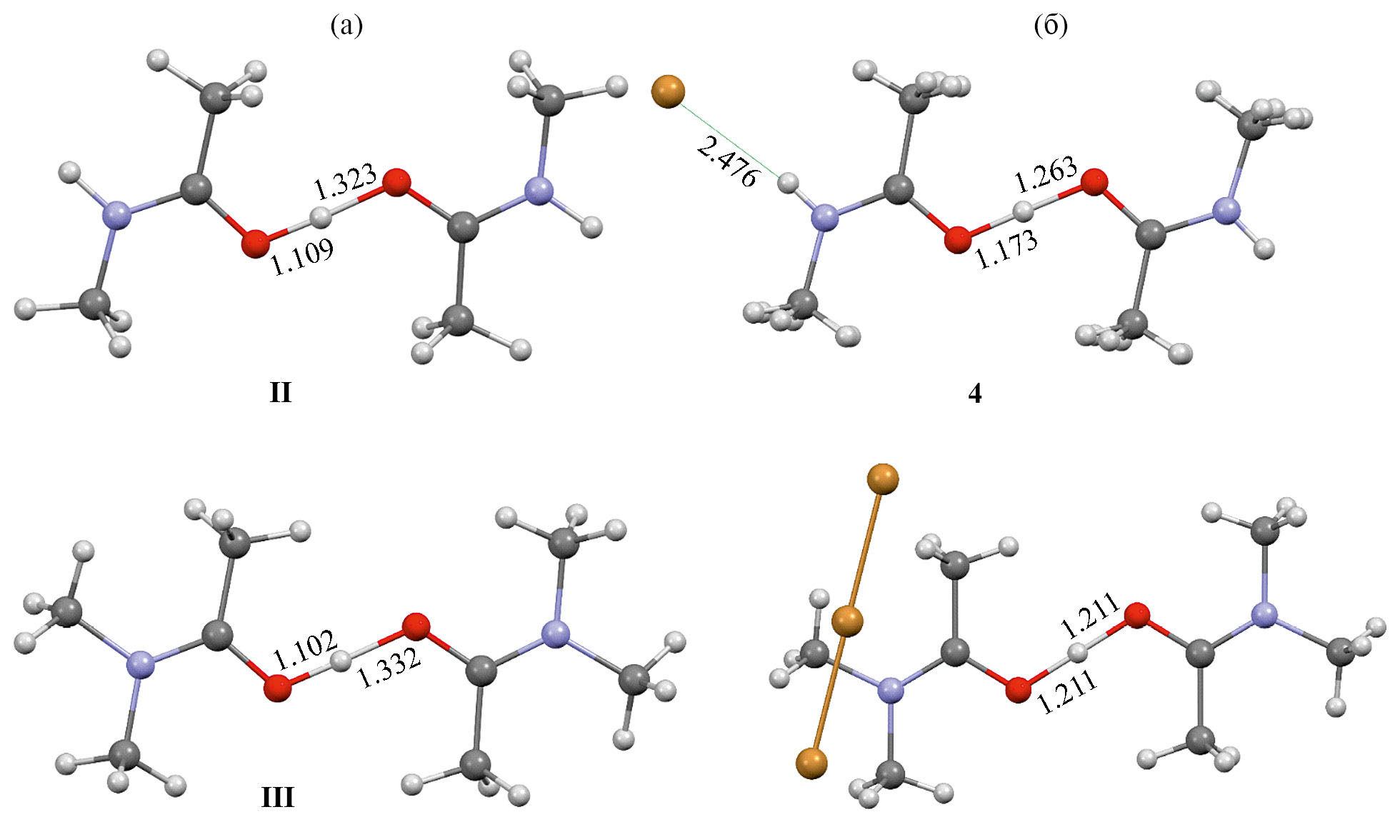 Рис. 3. Расчетные (а) структуры катиона бис(N-метилацетамид)водорода II и катиона бис(N,N-диметилацетамид)водорода III, экспериментальные (б) молекулярные структуры бромида бис(N-метилацетамид)водорода 4 [47] и дибромбромата бис(N,N-диметилацетамид)водорода [45].