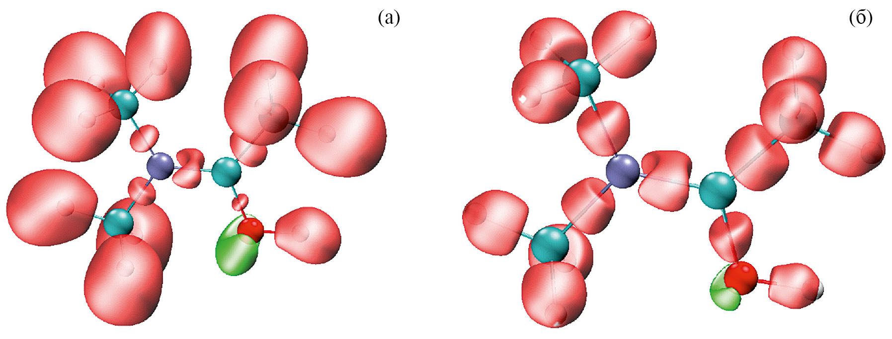 10. Рис. 6. ELF для цис-конформации НМА (а) и антиклинальной конформации амида 2 (б). Красным выделены дисинаптические, зеленым – моносинаптические бассейны.