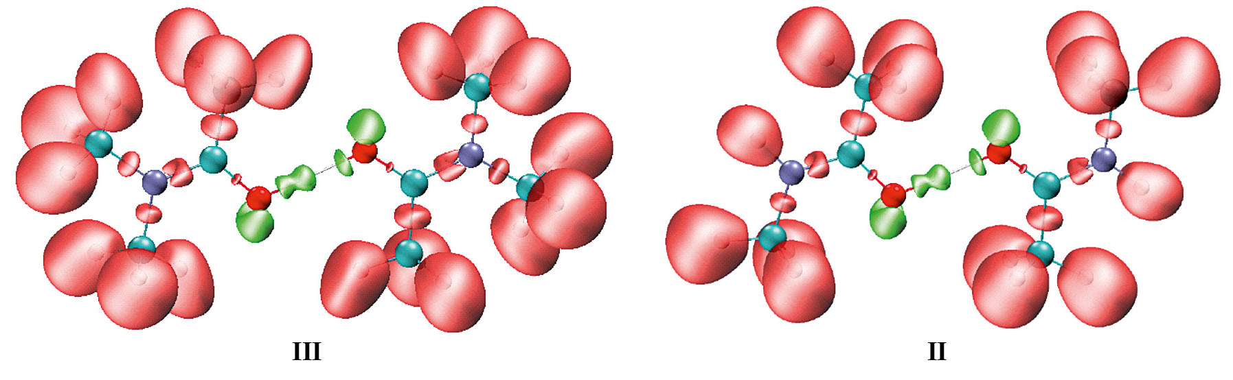 Судя по этим характеристикам и геометрии размещения атомов C⁵H⁷O³C² в молекулах ДМА и амида 2, контакт C–H···O=C можно рассматривать как вполне обычную слабую водородную связь [67]. На вероятность такого связывания указывалось в ранних работах [13], не включавших анализ электронного строения. Ранее взаимодействие метильных групп в молекуле ДМА рассматривалось как репульсивное [31]. Однако выявленные в молекулах ДМА и амида 2 взаимодействия C–H···H–C носят все признаки связывающих и не сводятся к притяжению противоположным образом поляризованных атомов водорода (диводородная связь [68, 69]). Природа таких взаимодействий, вероятно, ближе к внутримолекулярным водород-водородным [70, 71] и дальнодействующим межмолекулярным [72–74] аттрактивным H···H взаимодействиям, хотя это явление и не находит согласованного объяснения [75, 76] в рамках различных подходов, придерживающихся жесткого и нежесткого размежевания пространства [77]. Для взаимодействия C–H···CH₃ (контакт H¹⁰···C¹) можно усмотреть некоторую аналогию с металлорганическими соединениями [39], содержащими отрицательно поляризованный атом углерода. Заселенность бассейна атома C¹ незначительно превышает заряд ядра («заряд по Бейдеру» отрицателен), но роль этого обстоятельства неясна и требует отдельного детального исследования. Атом углерода может выступать в роли центра координации водородной связи даже в столь мало поляризованной структуре, как молекула этана [35, 38, 72] (как и в молекулах других алканов [36, 37]).