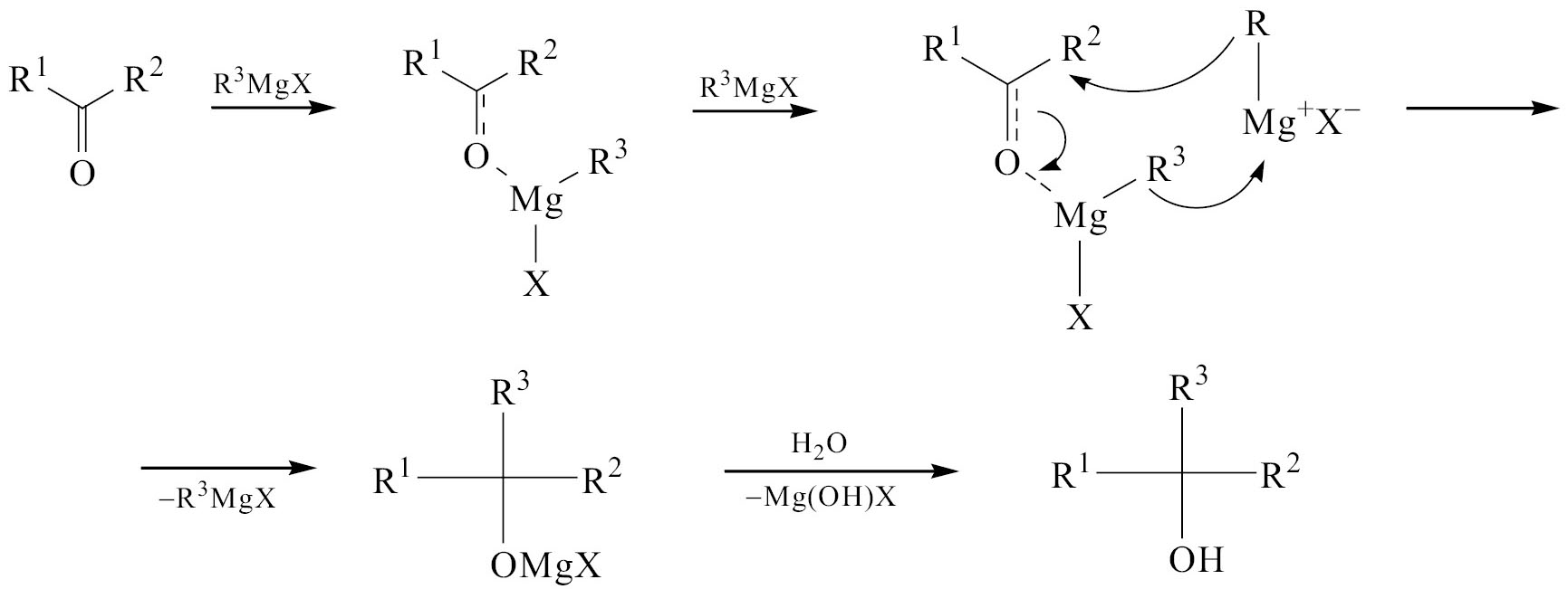 Полученные результаты хорошо согласуются с описанным в литературе [16, 17] механизмом взаимодействия карбонильных соединений с реактивами Гриньяра, где в реакции участвуют две молекулы магнийорганического соединения: одна из них первоначально координируется по атому кислорода, с участием второй образуется циклическое переходное состояние (схема 2), в котором происходит перенос гидрид-иона от β-углеродного атома магнийорганического соединения на углерод атом карбонильной группы. Образованию такого переходного состояния способствует донорно-акцепторное взаимодействие вакантной орбитали атома магния с неподеленной электронной парой атома кислорода карбонильной группы.