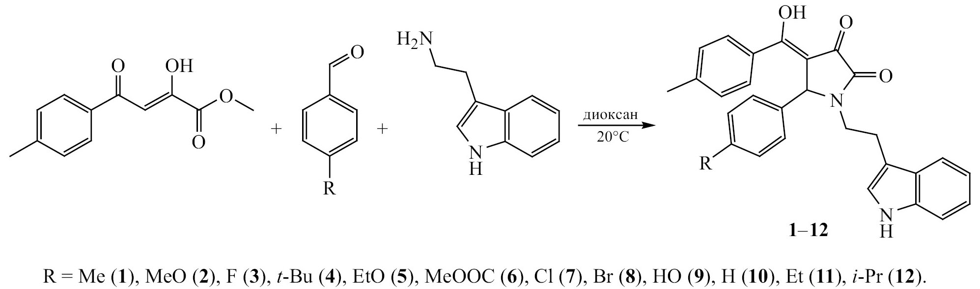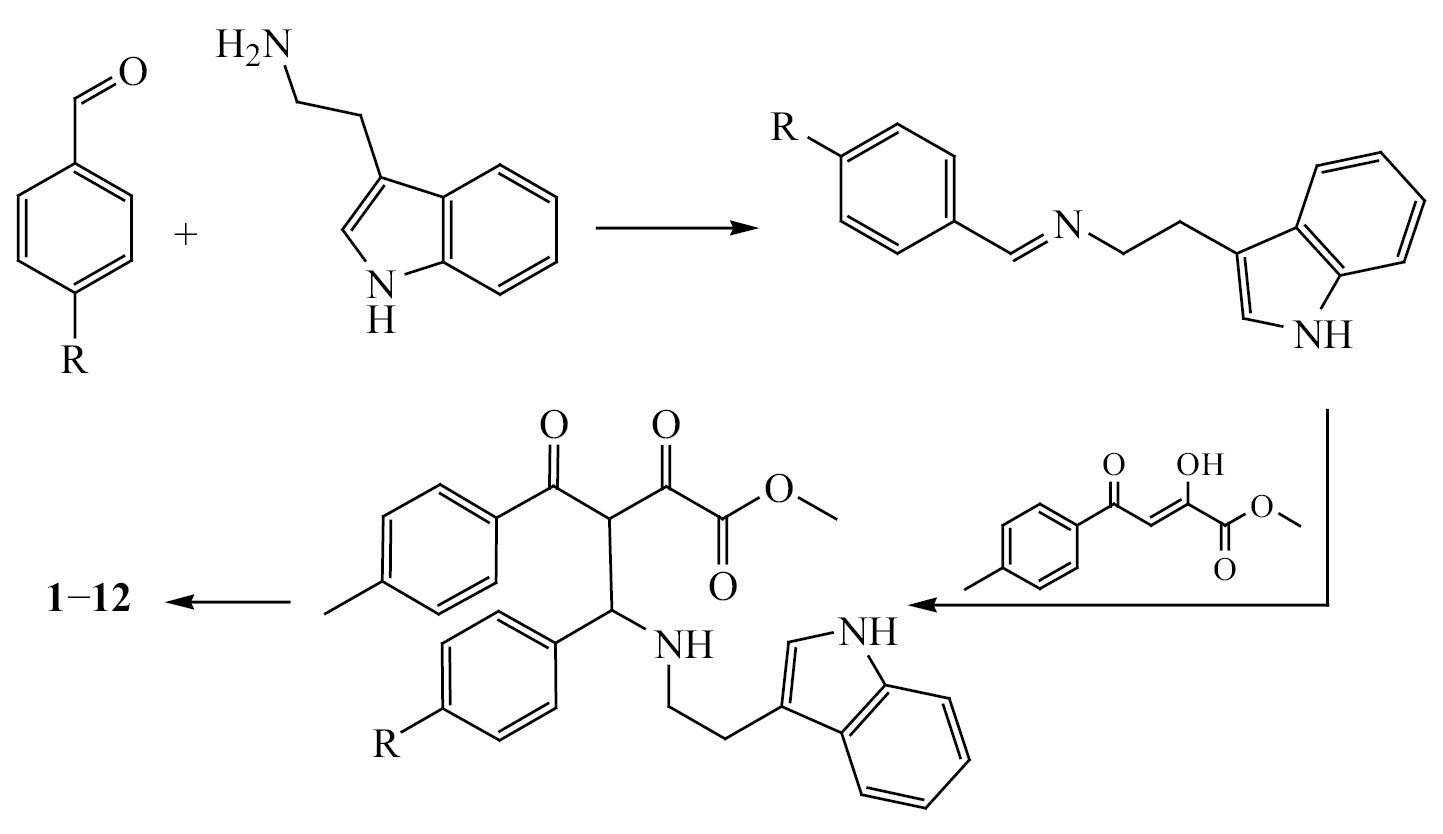 В результате проведенных исследований установлено, что кратковременное нагревание смеси триптамина, ароматического альдегида и метилового эфира 4-метилбензоилпировиноградной кислоты до растворения реагентов в диоксане с последующим выдерживанием в течение суток при комнатной температуре приводит к образованию 5-арил-1-[2-(1H-индол-3-ил)этил]-4-(гидрокси-4-метилфенилметилен)пирролидин-2,3-дионов 1–12 (схема 1).