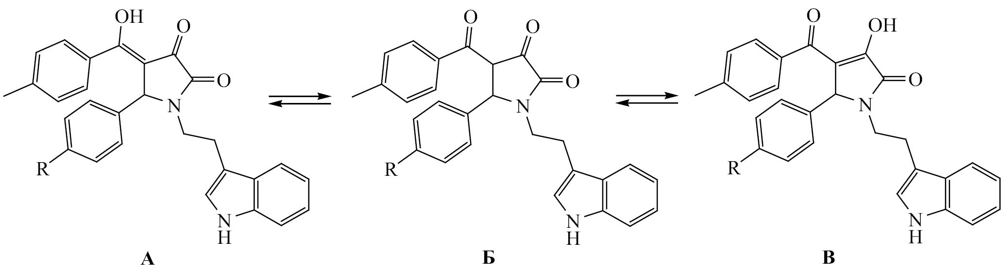 Таким образом, на основе трехкомпонентной реакции триптамина с ароматическими альдегидами и метиловым эфиром 4-метилбензоилпировиноградной кислоты получены 5-арил-1-[2-(1H-индол-3-ил)этил]-4-(гидрокси-п-толилметилен)пирролидин-2,3-дионы. Разработанный препаративный метод продолжает исследования в области комбинаторной химии биологически активных соединений данного ряда.