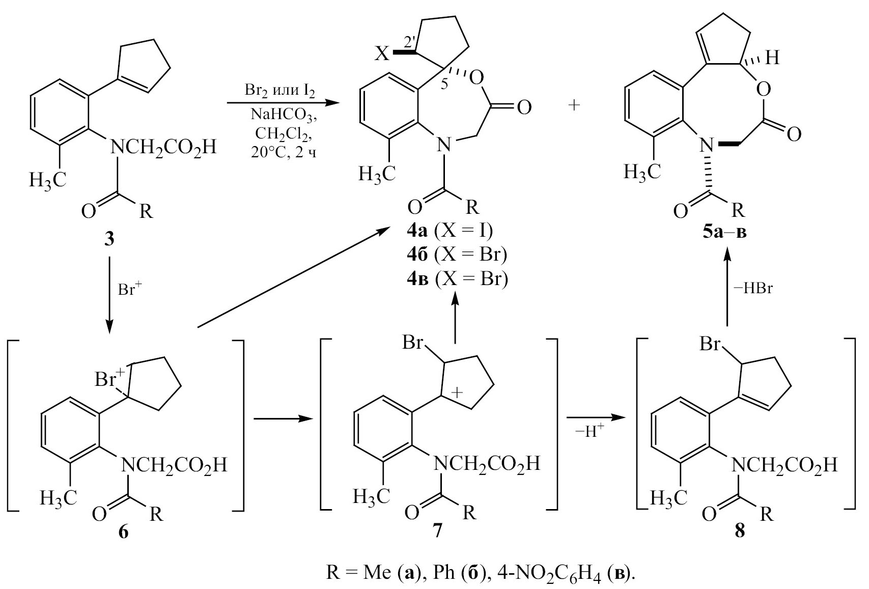 Мы предположили механизмы образования гетероциклов 4б, в через классическую 7-экзо-галолактонизацию [19] первоначально генерируемого иона бромония 6, которая приводит к бензоксазепинону 4. Другим направлением реакции является превращение ониевого иона 6 в карбокатион 7. От карбокатиона 7 отщепляется протон и образуется аллилгалогенид 8. Далее в результате внутримолекулярной конденсации путем замещения брома на кислород карбоксильной группы глицина 8 образуется восьмичленный лактон 5.