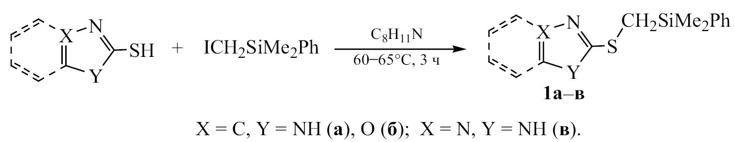 Взаимодействие 2/3-меркаптопроизводных бензимидазола, -бензоксазола, -1,2,4-триазола с 1-(иодметил)диметил(фенил)силаном (общая методика). Смесь 0.012 моля 2/3-меркаптопроизводного бензимидазола, бензоксазола или -1,2,4-триазола, 0.012 моля 1-(иодметил)диметил(фенил)силана и 0.012 моля 2,4,6-триметилпиридина перемешивали при температуре 60–65°С 3 ч до полной конверсии 2-меркаптоазолов. Затвердевшую реакционную массу растворяли в 10 мл ацетона. Соль отфильтровывали, промывали диэтиловым эфиром. Растворители из фильтрата удаляли при пониженном давлении, остаток растворяли в ацетоне и очищали колоночной хроматографией на силикагеле, используя ацетон в качестве элюента. После испарения растворителя твердый остаток соединений 1а–в сушили в вакууме. Физико-химические характеристики cоединений 1а–в совпадали с литературными данными [17].