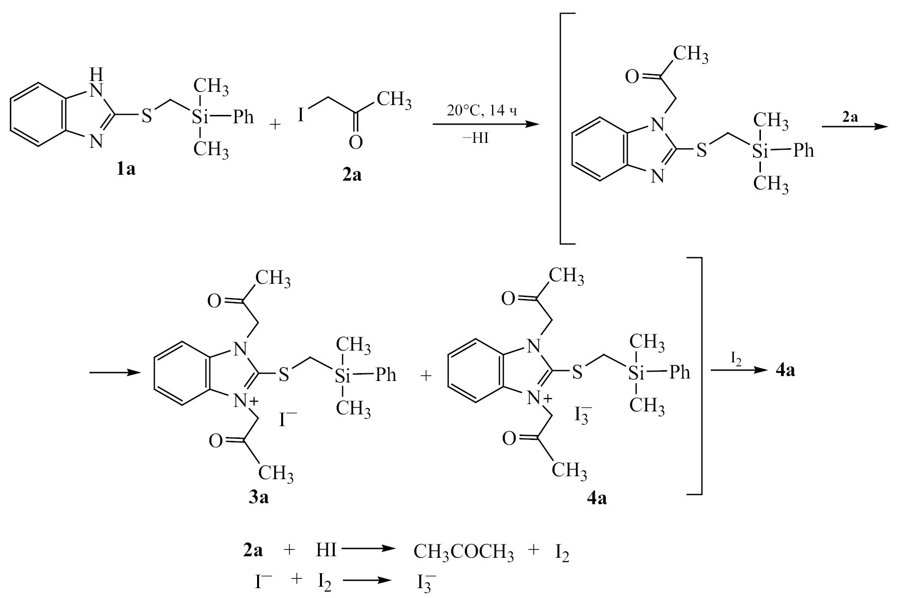 Взаимодействие 2-[диметил(фенил)силилметилтио]-1,3-бензимидазола 1а с 1-иод-пропан-2-оном 2а в соотношении 1:2 в отсутствие растворителя и основания при комнатной температуре приводит к образованию (по данным УФ спектроскопии) смеси моно- и трииодидов 2-[диметил(фенил)силилметилтио]-1,3-бис(2-оксопропил)бензимидазолия 3а и 4а в одну препаративную стадию (схема 2). Полная конверсия реагентов достигается за 14 ч. В отсутствие растворителя смесь гомогенизируется за счет исходного иодкетона. Трииодид-анион соли 4а формируется из иодид-аниона соли 3а и молекулярного иода, генерируемого в реакционной смеси in situ при частичном восстановлении исходного иодметилкетона выделившимся в процессе алкилирования иодоводородом. Как было показано ранее, разделение смеси моно- и трииодидов не вызывает затруднений [23, 24] вследствие существенного различия их растворимости в ацетоне. При его добавлении к реакционной смеси моноиодиды легко осаждаются, что позволяет выделить их в чистом виде. Введение же в органическую молекулу атома кремния изменяет растворимость соединений, что не позволяет разделить моно- и триииодиды 3а и 4а, поэтому смесь продуктов далее обрабатывали молекулярным иодом. Выход соли 4а составил 59% (схема 2).