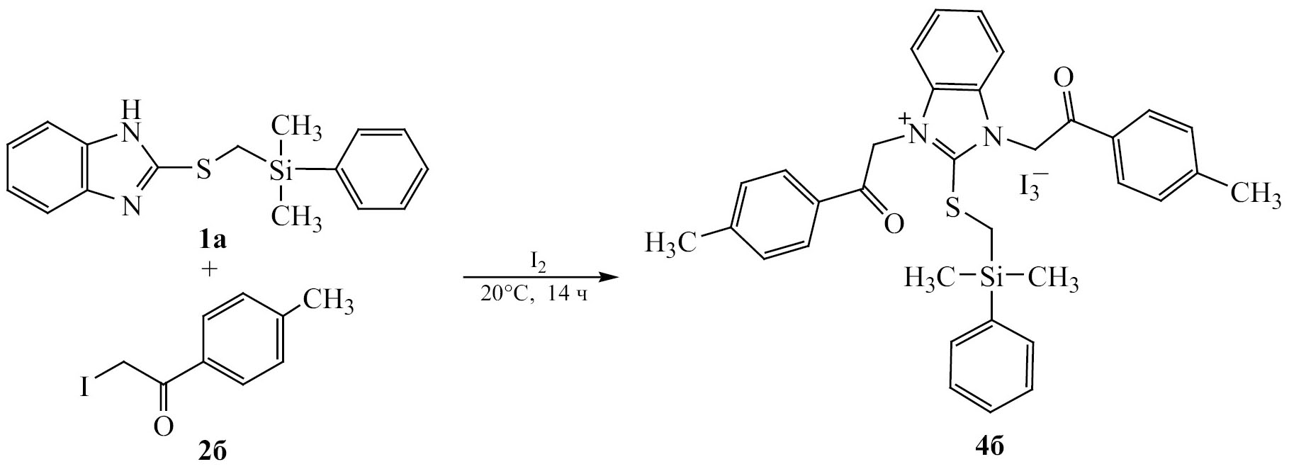 Реакция N-1,3-диалкилирования 2-меркаптопроизводного бензимидазола с иодметилкетоном 2б протекает аналогично. Выход трииодида 2-[диметил(фенил)силилметилтио]-1,3-бис[2-(4-метилфенил)-2-оксоэтил]бензимидазолия 4б составил 56%.