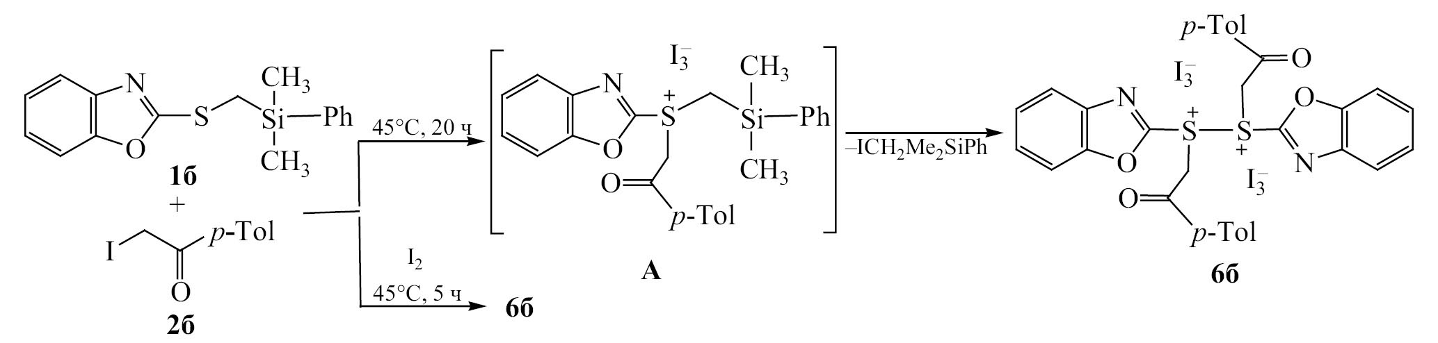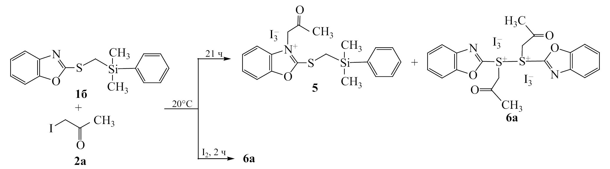 При замене бензимидазольного фрагмента в соединении 1а на бензоксазольный алкилирование по атому азота становится минорным процессом. При взаимодействии 2-[диметил(фенил)силилметилтио]1,3-бензоксазола 1б с иодкетоном 2а в аналогичных условиях трииодид 2-[диметил(фенил)силилметилтио]3-(2-оксопропил)-1,3-бензоксазолия 5 образуется с незначительным выходом (12%). Основным соединением неожиданно оказался продукт, не содержащий кремнийорганический фрагмент, а именно полииодид 1,2-бис(бензоксазол-2-ил)-1,2-бис[(4-метилфенил)-2-оксоэтил]дисульфоний-дикатиона 6а (схема 4).