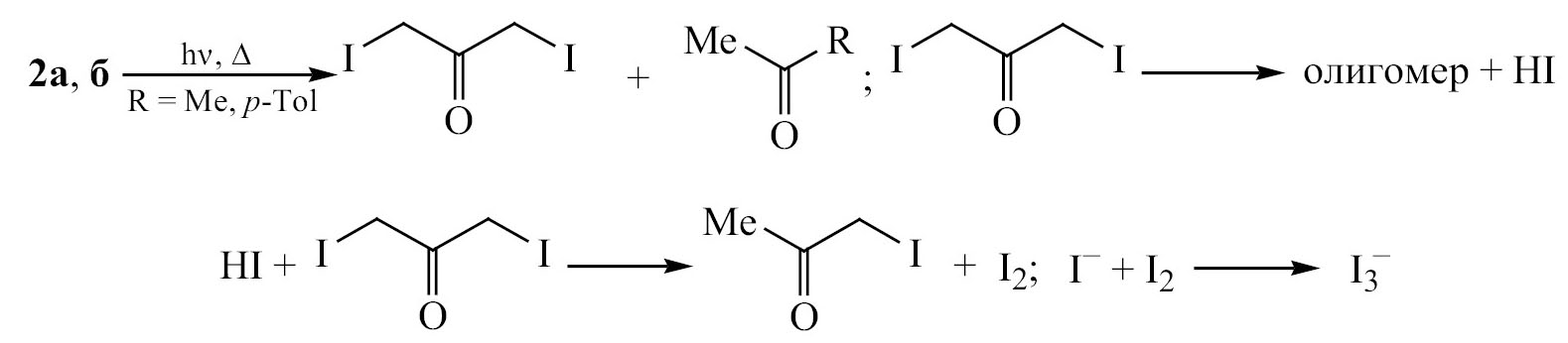 Образование продуктов S-алкилирования 6а и 6б, вероятно, связано с более высокой электроотрицательностью атома кислорода в бензоксазольном фрагменте. Атом кислорода оттягивает на себя электронную плотность, снижая нуклеофильность атома азота, и реакция бензоксазольного производного 1б с иодкетонами частично протекает по атому серы с образованием неустойчивой сульфониевой соли (аддукт А), которая далее при элиминировании иодметилсилана превращается в полииодид 6б с выходом 23% (схема 4). Низкий выход продукта реакции связан с расходованием исходного иодметилкетона на образование трииодид-аниона вследствие протекания in situ параллельных реакций олигомеризации, превращений с кетоном, особенно при длительном нагревании на свету, и образования молекулярного иода (cхема 6) [26].