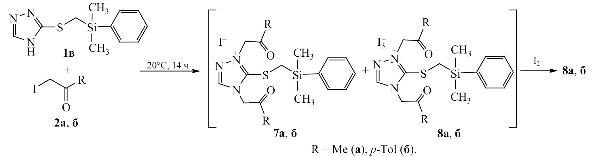 Реакция 3-[диметил(фенил)силилметилтио]-1,2,4-триазола 1в с α-иодкетонами 2а, б протекает аналогично взаимодействию бензимидазола 1а. Кетоалкилирование проходит исчерпывающе по двум атомам азота с образованием смеси моно- и трииодида 3-[диметил(фенил)силилметилтио]-2,4-бис(2-оксопропил)-1,2,4-триазолия 7а, 8а и 3-[диметил(фенил)силилметил]тио-2,4-бис[2-(4-метилфенил)-2-оксоэтил]-1,2,4-триазолия 7б, 8б, которые обрабатывали молекулярным иодом в ацетоне, получая соответствующие трииодиды триазолия 8а, б с выходом 51 и 48% (схема 7).