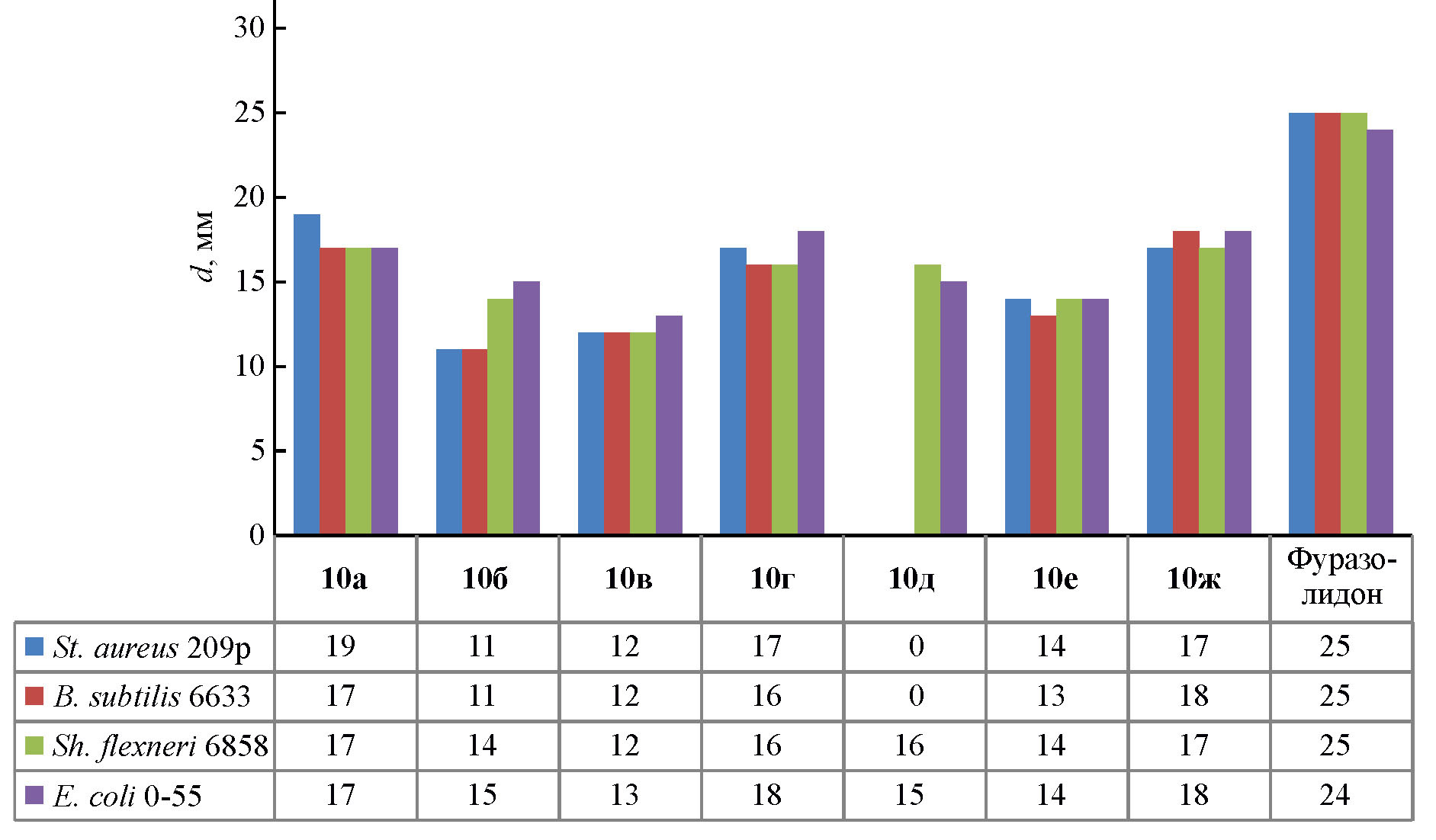 Антибактериальная активность соединений 10а–ж изучена методом «диффузии в агаре» при бактериальной нагрузке 20 млн микробных тел на 1 мл среды [25]. В опытах использованы четыре штамма микроорганизмов: грамположительные стафилоккоки (St. aureus 209p, B. subtilis 6633) и грамотрицательные палочки (Sh. flexneri 6858, E. сoli 0-55), в качестве положительного контроля выступал лекарственный препарат фуразолидон [26].