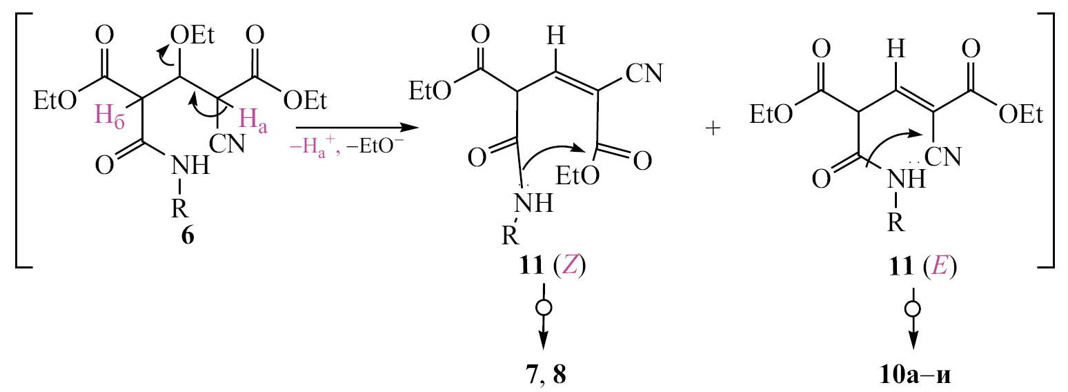 Образование соединений 10а–и можно объяснить тем, что промежуточный ациклический аддукт Михаэля 6 до циклизации, в отличие от аддукта Михаэля 3, по-видимому, подвергается элиминированию с отщеплением этилат-аниона и протона Ha+ с образованием замещенных олефинов 11 (Z,E)-конфигурации. На наш взгляд, из-за пространственных затруднений в изомере (Z)-11, дальнейшей циклизации подвергается изомер (E)-конфигурации с образованием соединений 10а–и (схема 3).