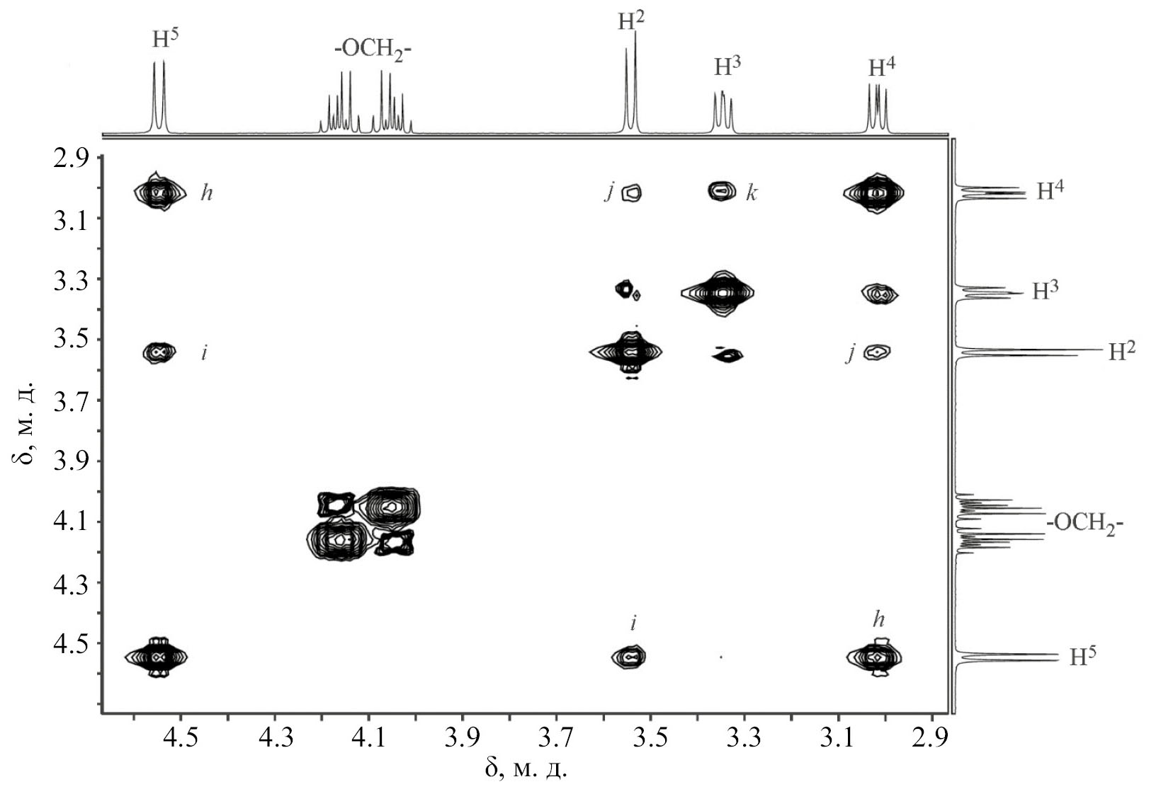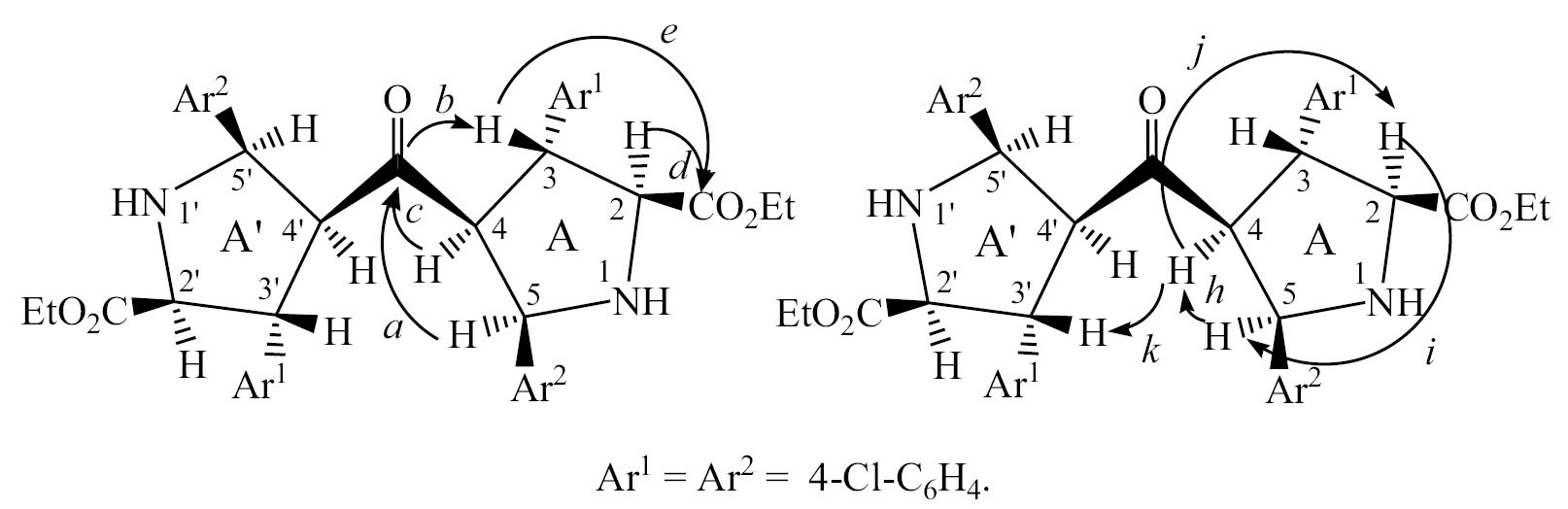 Стереоселективность реакции определяли посредством NOESY-эксперимента (рис. 3). Кросс-пики h, i и j отражают взаимодействие пространственно сближенных пар протонов Н5–Н4, Н5–Н2 и Н4–Н2 соответственно, что возможно лишь в случае цис-расположения протонов в этих парах (схема 2). Отдельно следует отметить наличие кросс-пика k, который отвечает взаимодействию протонов соседних пирролидиновых циклов (пары Н3′–Н4 и Н3–Н4′). Это возможно благодаря конформационному вращению циклов относительно связей C4′–Cкетон и Cкетон–C4, в ходе которого указанные пары протонов оказываются в сближенном положении.