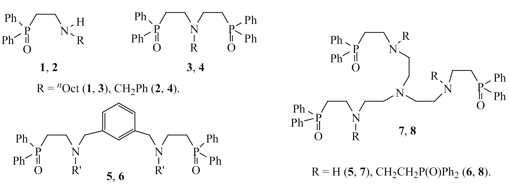 Цель настоящей работы – исследование влияния строения олигодентатных β-аминофосфорильных соединений 1–8 (схема 1) на эффективность экстракции Re(VII) из растворов минеральных кислот, а также оценка возможности использования этих соединений в качестве активного компонента комплексообразующих сорбентов.