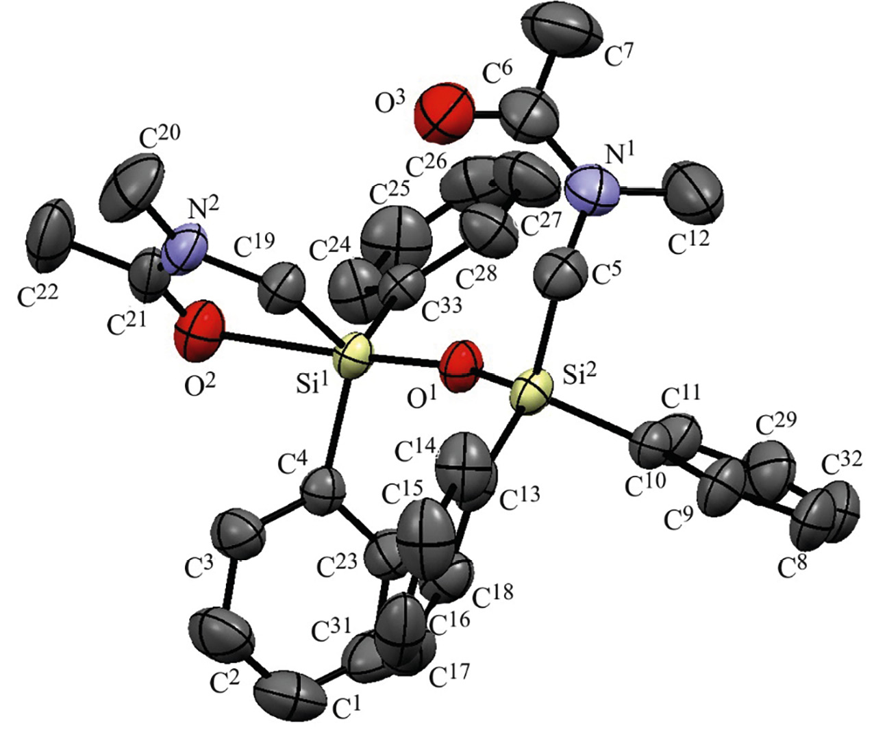 Таким образом, гидролиз N-[хлор(дифенил)силил]метил-N-метилацетамида влагой воздуха приводит к образованию 1,1,3,3-тетрафенил-1,3-бис(N-метилацетамидометил)-1,3-дисилоксана. Рентгеноструктурный анализ показал, что этот силоксан в кристалле существует в виде нейтрального (O–Si) монохелатного пентакоординированного соединения кремния с аксиальной силоксановой группой.