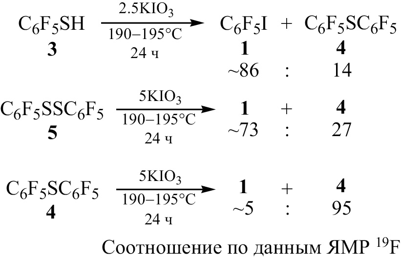 Сравнительные реакции пентафторбензолтиола 3, декафтордифенилдисульфана 5 и декафтордифенилсульфана 4 с KIO3. а. В металлическом кожухе нагревали запаянную ампулу со смесью тиола 3 (0.212 г, 1.06 ммоль) и KIO3 (0.576 г, 2.69 ммоль) при 190–195°C в течение 24 ч. По окончании выдержки ампулу охлаждали, вскрывали, содержимое экстрагировали ~2 мл CHCl3. Согласно данным ЯМР 19F, смесь содержала соединения 1 и 4 в соотношении 86:14.
