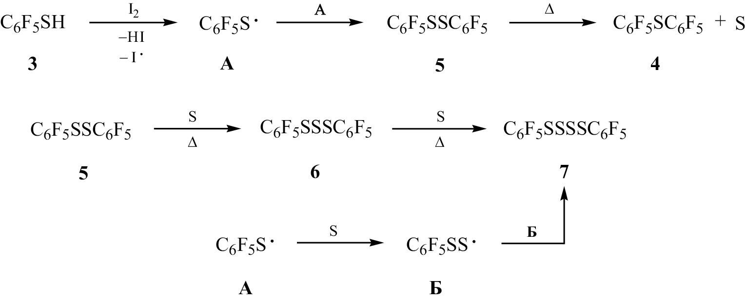 Можно предположить путь протекания этих реакций, включающий взаимодействие иода с тиолом 3 и генерацией радикала A аналогично описанному ранее процессу взаимодействия тиола 3 с иодом в присутствии тетрафторэтилена в проточной системе [20]. Образующийся в результате димеризации радикала А дисульфан 5 термически мог бы превращаться в сульфан 4 и серу. При взаимодействии серы с дисульфаном 5 можно было ожидать образования трисульфана 6, а затем аналогично и тетрасульфана 7 (схема 3). Кроме этих путей, по-видимому, не исключено взаимодействие радикала А с серой, приводящее сначала к пентафторбензолдитиильному радикалу Б, а затем к тетрасульфану 7 в результате димеризации радикала Б (схема 3). Другой путь образования радикала Б и схемы синтеза три- и тетрасульфанов 6 и 7 предложены в работе [26]. Вероятно, образование более высокомолекулярных декафтордифенилполисульфанов происходит аналогично приведенным выше превращениям.