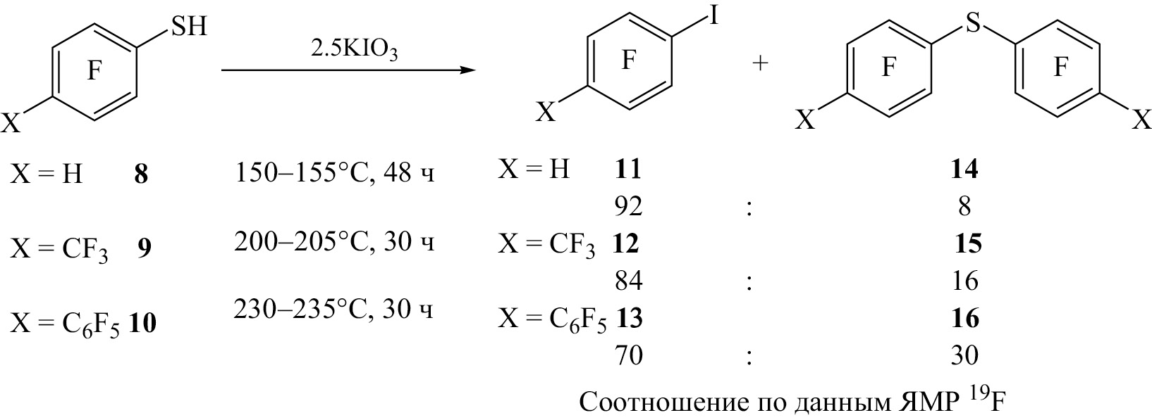 Таким образом, при исследовании реакции полифторарентиолов с KIO3, а также реакции с иодом показано, что превращения с KIO3 приводят к получению иодполифтораренов в качестве основных продуктов наряду с диполифторарилсульфанами. Реакция тиола 3 с иодом оказалась малоэффективной для получения иодарена 1.