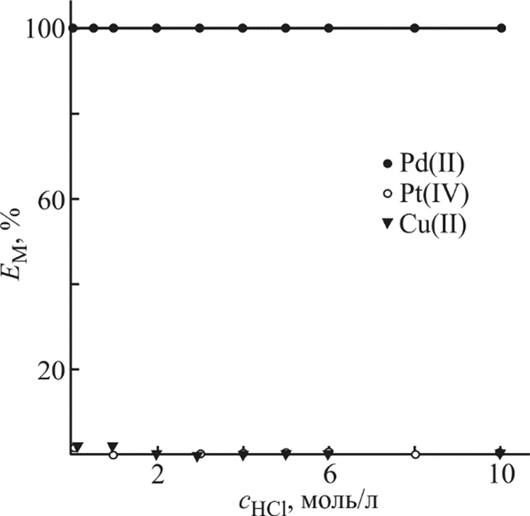 Рис. 2. Зависимость степени извлечения палладия(II), платины(IV) и меди(II) реагентом L в хлороформе от концентрации хлористоводородной кислоты в водной фазе. сPd = 0.0056 моль/л, сL = 0.010 моль/л; сPt = 0.0050 моль/л, сL = 0.010 моль/л; сCu = 0.0050 моль/л, сL = 0.015 моль/л; время контакта фаз – 20 мин.