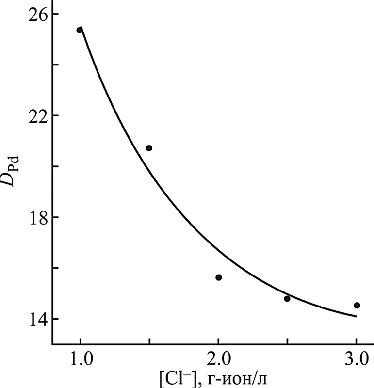 Изучено влияние некоторых факторов на экстракцию Pd(II) реагентом L из 1 М. растворов HCl. Показано, что увеличение концентрации NaCl от 0 до 2 моль/л в растворе при постоянной кислотности водной фазы сопровождается уменьшением коэффициента распределения Pd(II) почти в 2 раза (рис. 4), однако степень извлечения Pd(II) реагентом L изменяется незначительно – от 96.2 до 93.6%. Это позволяет использовать данный экстрагент для эффективного извлечения Pd(II) из растворов с умеренным солевым фоном. Изменение температуры от 20 до 40°С не оказывает заметного влияния на извлечение Pd(II) из 1 М. раствора HCl, содержащего 0.0049 моль/л Pd(II), раствором 0.0050 моль/л L: степень извлечения Pd(II) составляет >99.9%. Уменьшение температуры до 10°С сопровождается уменьшением степени извлечения Pd(II) до 98.1%, что характеризует процесс экстракции Pd(II) как эндотермический.